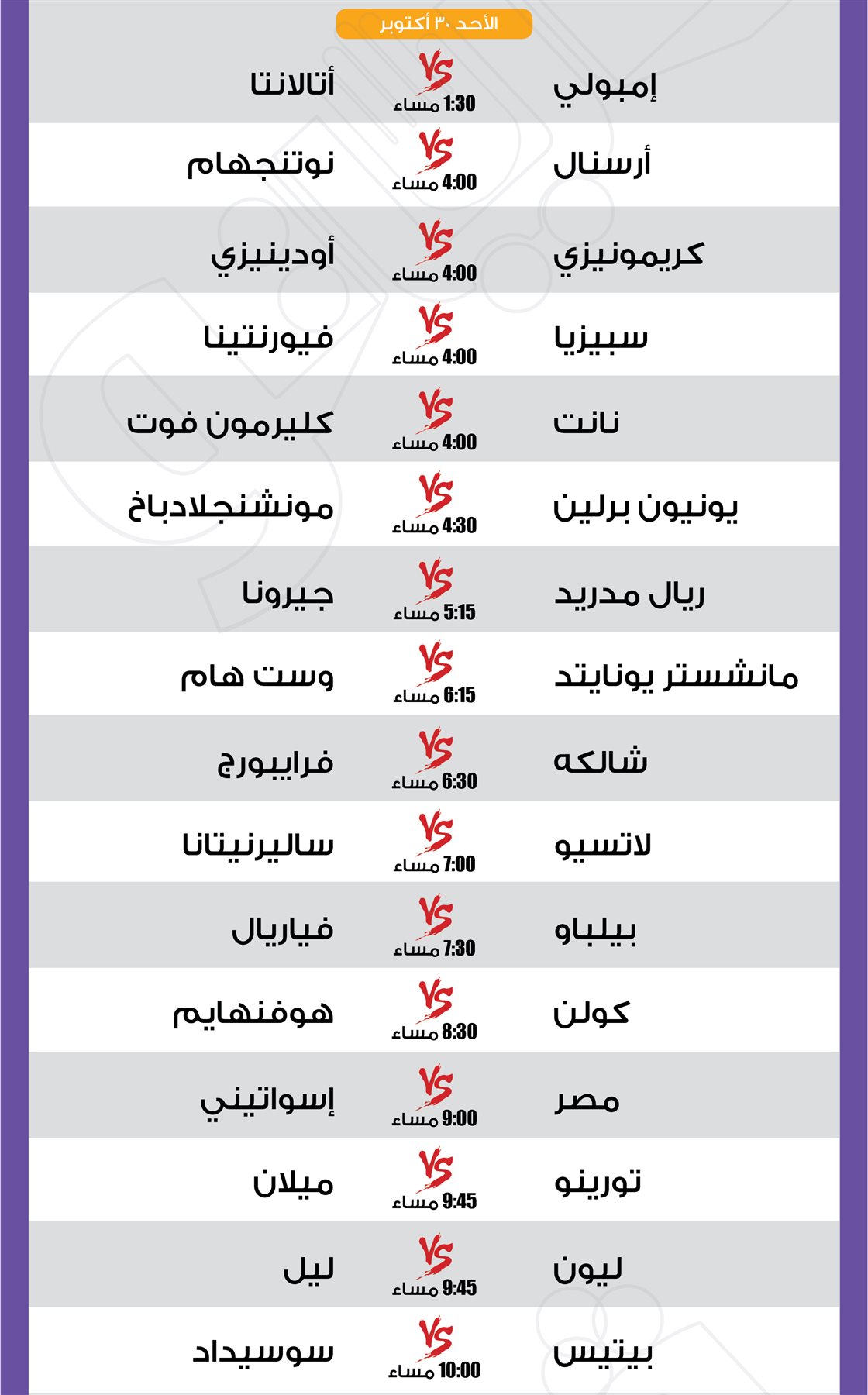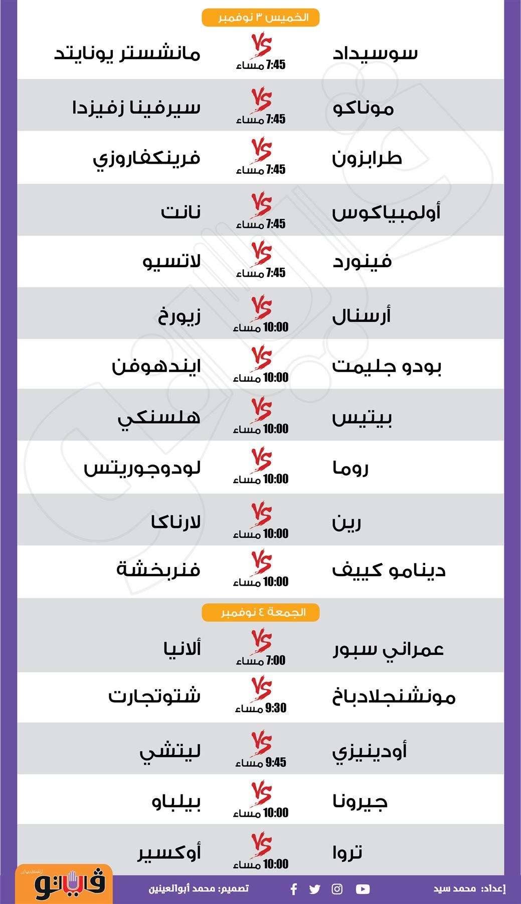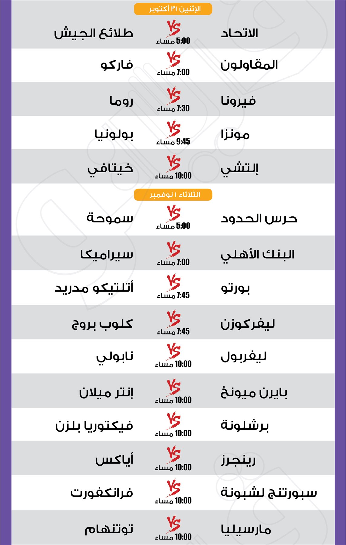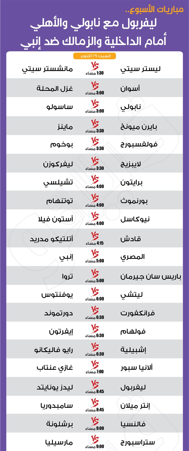 مباريات الأسبوع.. ليفربول مع نابولي والأهلي أمام الداخلية والزمالك ضد إنبي| إنفوجراف الجمعة 28/أكتوبر/2022 - 05:54 م 10/28/2022 5:54:21 PM مباريات الأسبوع محمد سيد شارك طباعة 18 حجم الخط شارك طباعة ليفربول نابولي الأهلي الزمالك أنبي الداخلية مانشستر سيتي ريال مدريد باريس سان جيرمان بايرن ميونخ