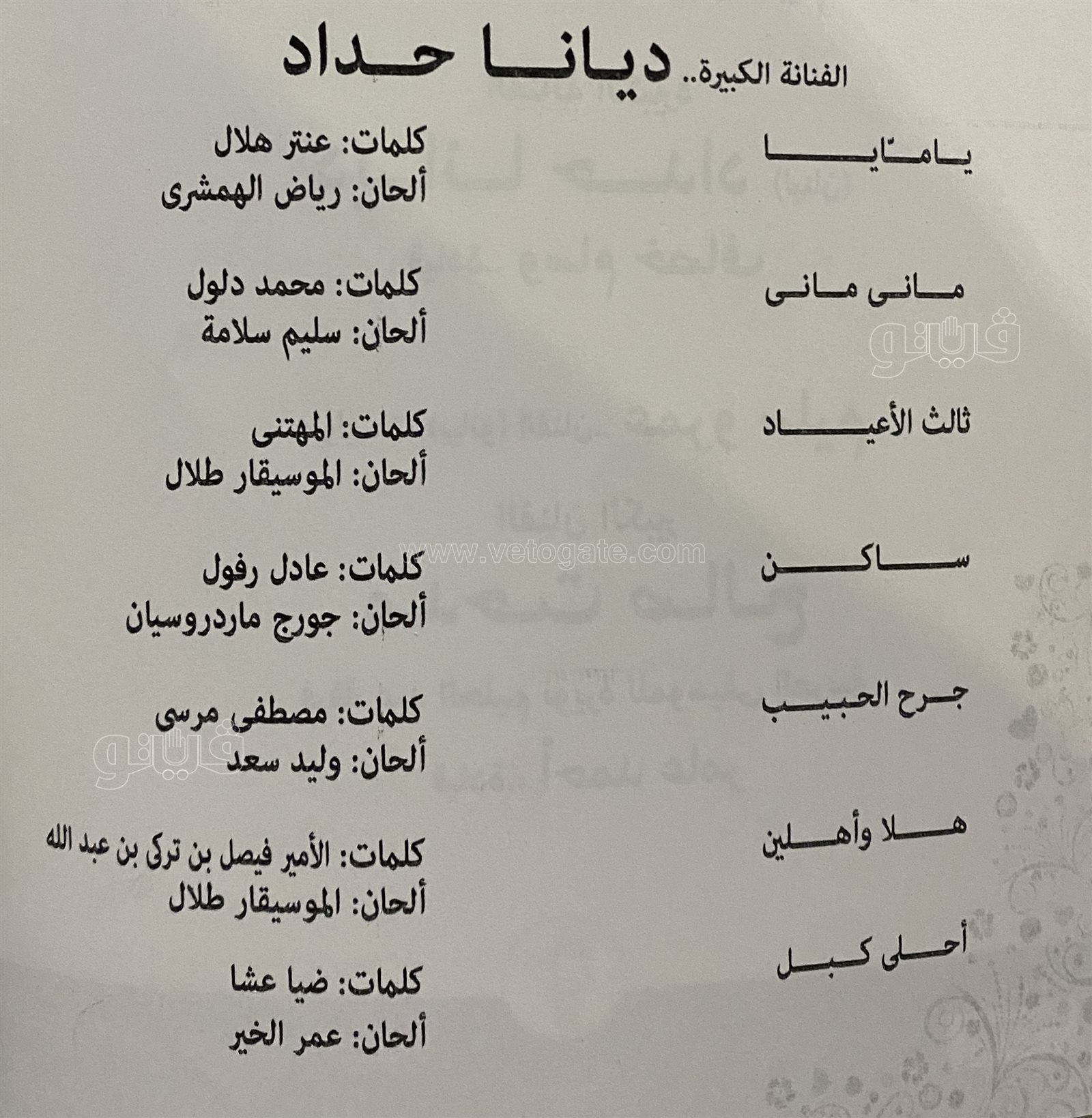 وتتغنى ديانا حداد خلال الحفل بباقة من أجمل أغانيها والتي يحبها الجمهور كالتالي: