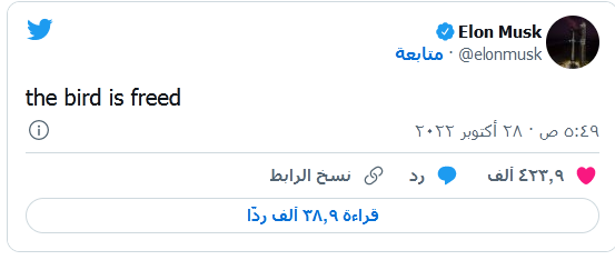 وكان ماسك قد نشر تغريدة على صفحته الخاصة معلنًا فيها "تحرير العصفور".