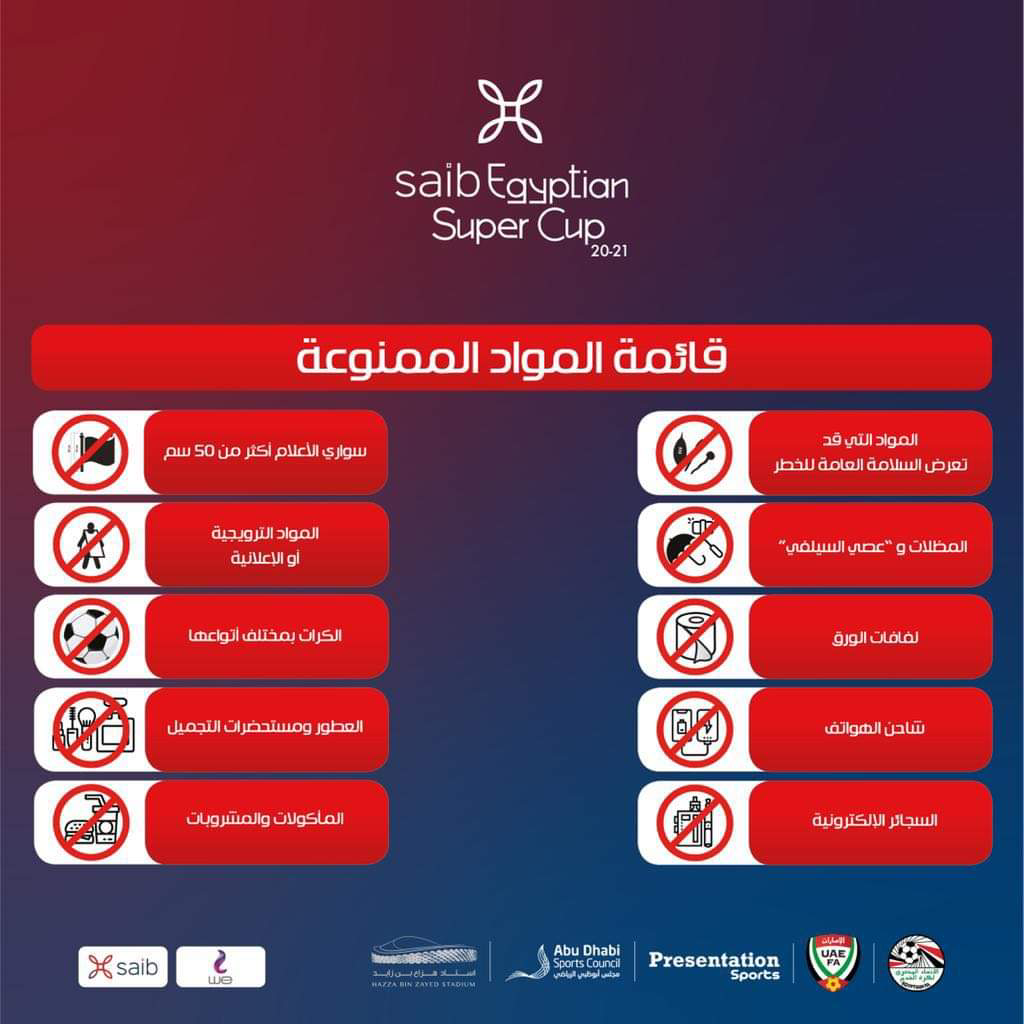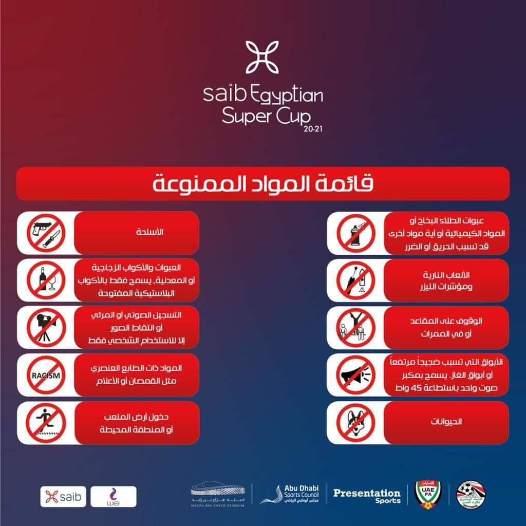 واصدرت اللجنة المنظمة لمباراة السوبر المصري بالتنسيق مع مجلس أبوظبي الرياضي أصدرت عددًا من الإرشادات، لحضور الجماهير في ملعب هزاع بن زايد بالعين من أجل التيسير على الحضور، وخروج المباراة بالشكل الذي يليق بالكرة المصرية.