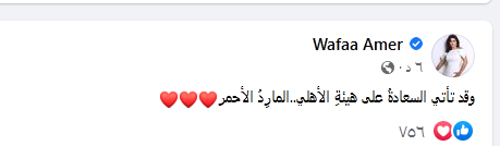 علقت الفنانة وفاء عامر على فوز الأهلي بالسوبر المصري عقب المباراة حيث كتبت على صفحتها الرسمية على الفيس بوك :" وقد تأتي السعادةُ على هيئةِ الأهلي.. المارِدُ الأحمر "