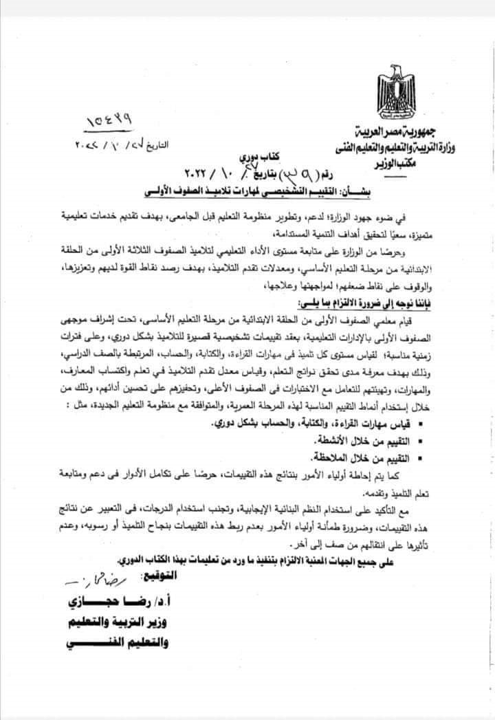 أصدرت وزارة التربية والتعليم والتعليم الفني خطابا مهما وعاجلا إلي جميع المديريات التعليمية ، بشأن تقييمات طلاب الصفوف الثلاثة الأولي خلال العام الدراسي 2022-2023.