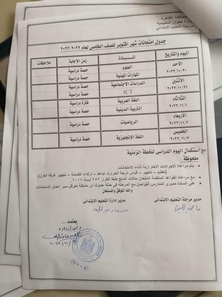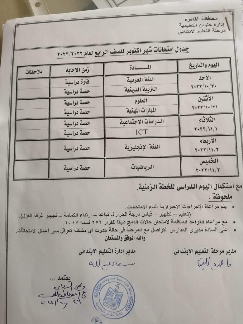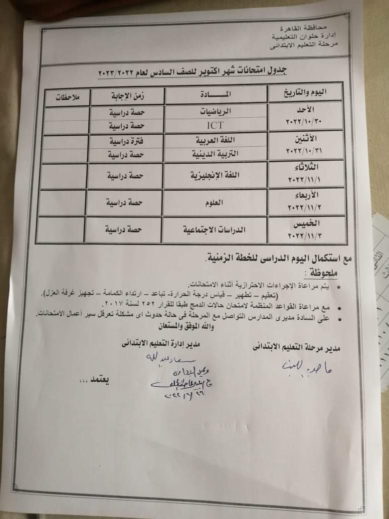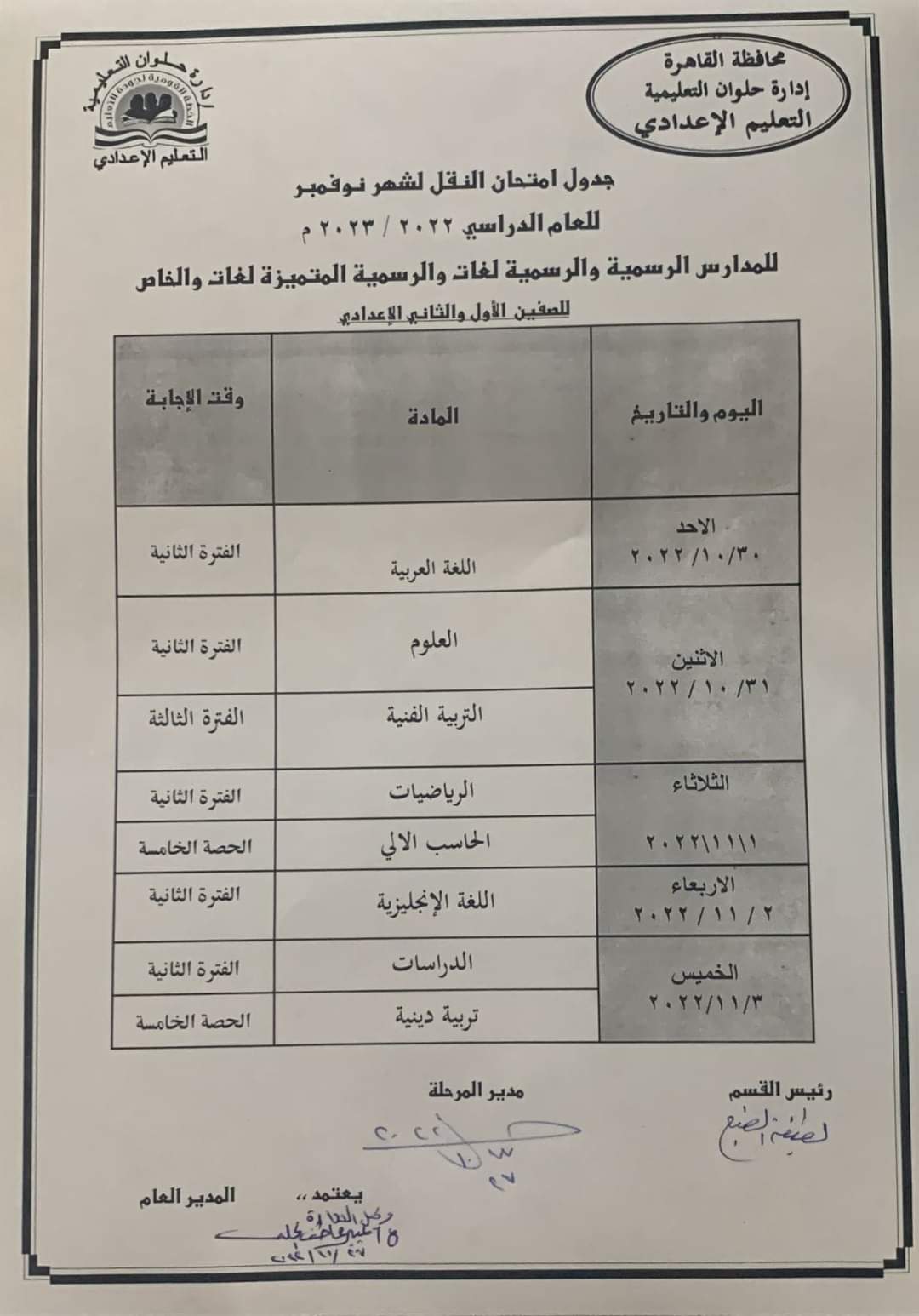 أعلنت مديرية التربية والتعليم بمحافظة القاهرة، جدول امتحانات شهر أكتوبر، لطلاب صفوف النقل من السادس الابتدائي للثاني الثانوي العام للعام الدراسي الحالي 2022-2023.