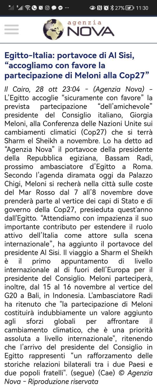 جاء ذلك ردًا على سؤال وكالات الأنباء الايطالية، حيث علق السفير بسام راضي المتحدث الرسمي لرئاسة الجمهورية المصرية على إعلان مجلس الوزراء الإيطالي مشاركة رئيسة الوزراء ميلوني في قمة COP 27، وقال: بكل تأكيد ترحب مصر بزيارة ميلوني رئيسة وزراء ايطاليا الصديقة لمصر، وكذلك كافة الزعماء ورؤساء الدول والحكومات، تلبية لدعوة الرئيس عبد الفتاح السيسي، ومشاركتها في قمة قادة العالم التي ستعقد في شرم الشيخ نوفمبر القادم لمؤتمر أطراف اتفاقية الأمم المتحدة الإطارية لتغير المناخ، ونتطلع للمساهمة الهامة للسيدة ميلوني امتدادًا لدور ايطاليا الفاعل على الساحة الدولية.