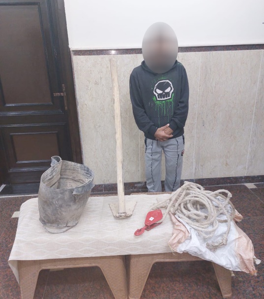 تمكنت الإدارة العامة للبحث الجنائى بقطاع شرطة السياحة والآثار عقب تقنين الإجراءات وبالتنسيق مع قطاع الأمن العام من ضبط أحد الأشخاص- مقيم بدائرة قسم شرطة الدخيلة بالإسكندرية لقيامه بالحفر خلسة للبحث عن الآثار داخل مسكنه، وعُثر بداخله على (حفرة بعمق ٥ أمتار- الأدوات المستخدمة فى الحفر).
