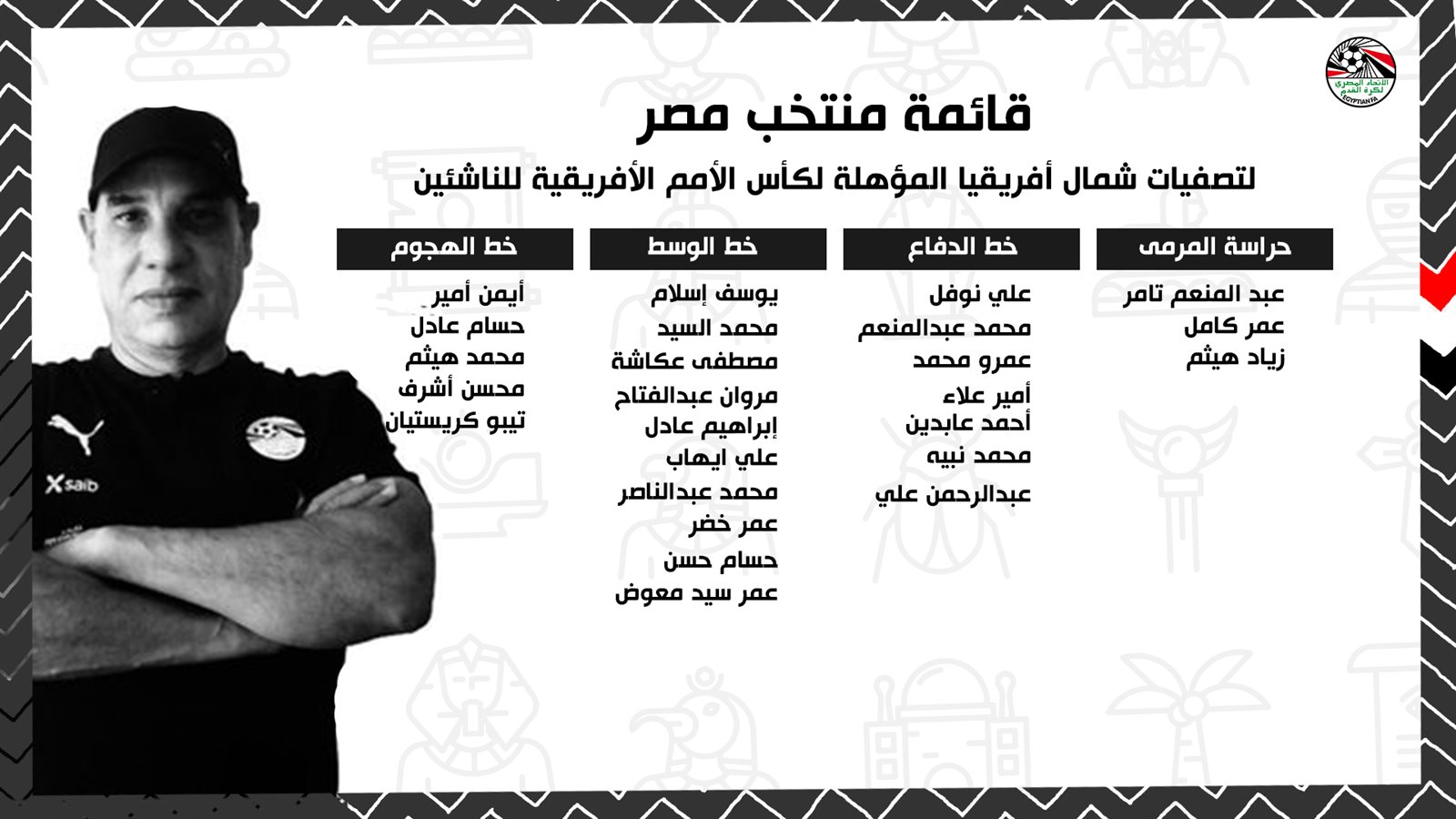 أعلن محمد وهبة المدير الفني لمنتخب الناشئين مواليد 2006 عن القائمة النهائية التي ستغادر إلى الجزائر لخوض تصفيات شمال أفريقيا المؤهلة لكأس الأمم الأفريقية للناشئين "الجزائر 2023".
