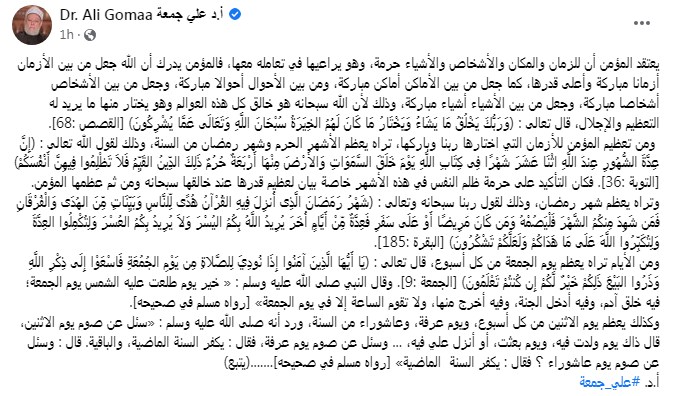 وكتب علي جمعة تدوينة على الفيس بوك "يعتقد المؤمن أن للزمان والمكان والأشخاص والأشياء حرمة، وهو يراعيها في تعامله معها، فالمؤمن يدرك أن الله جعل من بين الأزمان أزمانا مباركة وأعلى قدرها، كما جعل من بين الأماكن أماكن مباركة، ومن بين الأحوال أحوالا مباركة، وجعل من بين الأشخاص أشخاصا مباركة، وجعل من بين الأشياء أشياء مباركة، وذلك لأن الله سبحانه هو خالق كل هذه العوالم وهو يختار منها ما يريد له التعظيم والإجلال، قال تعالى: ﴿وَرَبُّكَ يَخْلُقُ مَا يَشَاءُ وَيَخْتَارُ مَا كَانَ لَهُمُ الخِيَرَةُ سُبْحَانَ اللَّهِ وَتَعَالَى عَمَّا يُشْرِكُونَ﴾ [القصص:68].