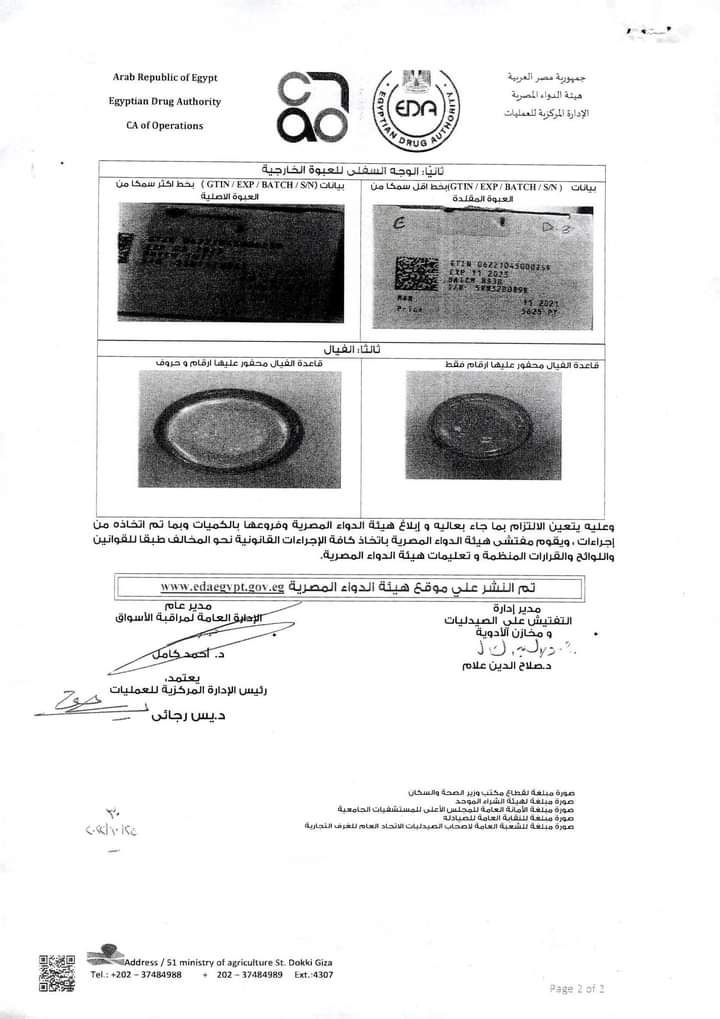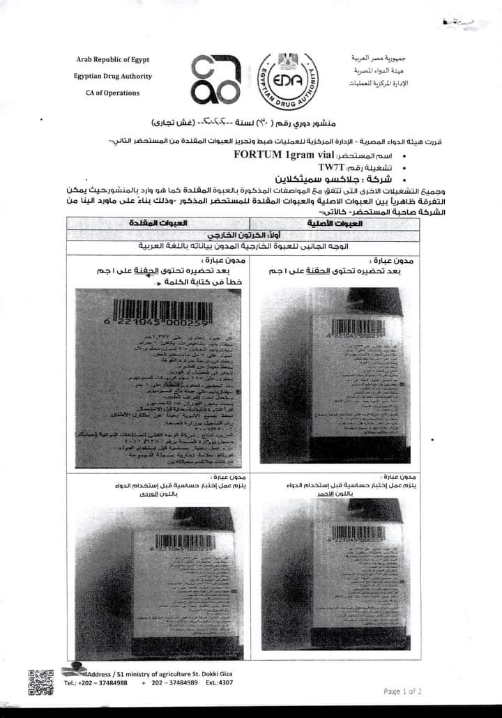 أصدرت هيئة الدواء المصرية منشورا دوريا رقم ٣٠ لسنة ٢٠٢٢ بشأن ضبط مستحضرات مغشوشة من دواء FORTUM مطالبة بضبط وتحريز العبوات المقلدة وجمعها من السوق.