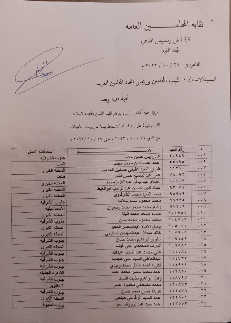 ويشار إلى أن لجنة القيد بالنقابة العامة للمحامين، أخطرت عبدالحليم علام، نقيب المحامين، رئيس اتحاد المحامين العرب، بأنه تنفيذًالأحكام قانون المحاماة المادة (12)، وبناء على البحث في مخالفات التأمينات عن قطاعي التأمين «قطاع الأعمال العام والخاص» و«القطاع الحكومي»، تم إسقاط القيد عن 794 عضوًا في الفترة من 1 حتى 20 أكتوبر الجاري، حيث وضحت نتيجة الفحص في برنت التأمينات الخاصة بكل منهم عملهم بعمل غير مهنة المحاماة.