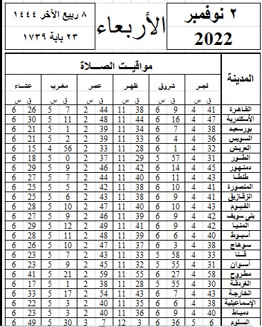 مواقيت الصلاة اليوم وفقًا للتوقيت المحلي لمدينتي القاهرة والإسكندرية وعدد من مدن ومحافظات الجمهورية من واقع بيانات الهيئة العامة للمساحة: