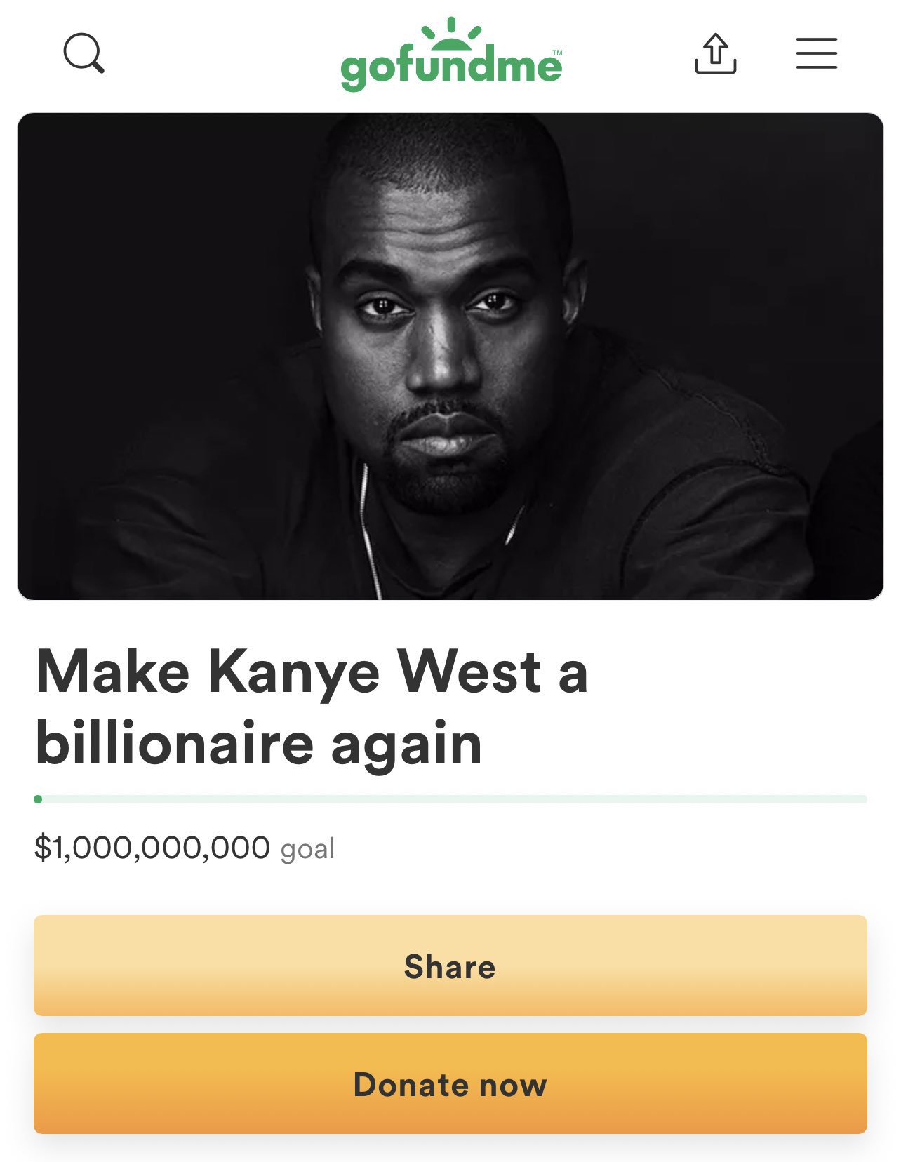 دشن عدد من معجبي مغني الراب ورجل الأعمال كانييه ويست، صفحة علي موقع التبرعات الشهير، gofundme وذلك لجعله مليارديرًا مرة أخري، وذلك بعد أن انخفضت ثروته لـ ٤٠٠ مليون دولار، ويفقد رسميًا لقب ملياردير.