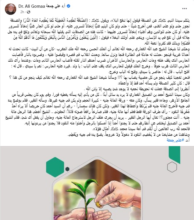 وكتب علي جمعة تدوينة على الفيس بوك قال فيها:"يتكلم سيدنا النبي ﷺ عن الصدقة فيقول إنها تدفع البلاء، ويقول ﷺ: (الصَّدَقَةُ تُطْفِىءُ الْخَطِيئَةَ كَمَا يُطْفِىءُ المَاءُ النَّارَ) والصدقة تجوز حتى ولو على الغني، فمن أخرج شيئًا- حتى ولو كان اليتيم غنيًّا إدخالًا للسرور عليه، أو حتى لو كان الجار غنيًّا إدخالًا للسرور عليه، أو كان حتى للوالدين وهم أغنياء إدخالًا للسرور عليهما- كانت هذه من الصدقات التي يقبلها الله سبحانه وتعالى وتقع في يده جل جلاله قبل أن تقع في يد الإنسان، وينعي على أولئك البخلاء فيقول: {الَّذِينَ يَبْخَلُونَ وَيَأْمُرُونَ النَّاسَ بِالْبُخْلِ وَيَكْتُمُونَ مَا آَتَاهُمُ اللَّهُ مِنْ فَضْلِهِ} وبذلك فقد كفروا نعمة الله."