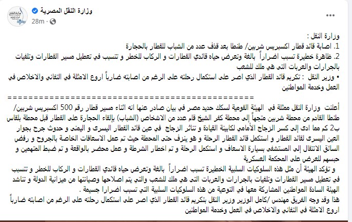 وكتبت الصفحة الرسمية لوزارة النقل في بيانها بالفيس بوك أن "قائد قطار اكسبريس شربين/ طنطا أصيب بعد قذف عدد من الشباب للقطار بالحجارة"