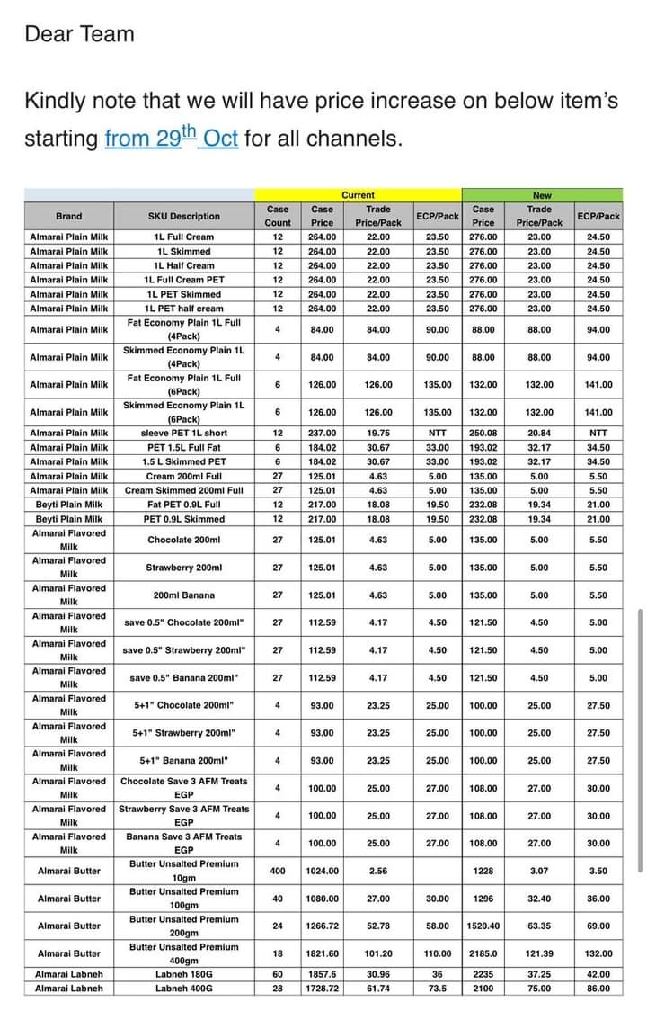 وأرسلت شركة المراعي؛ قائمة أسعار للتجار تتضمن بعض الزيادات على بقية منتجات الألبان من الشركة.