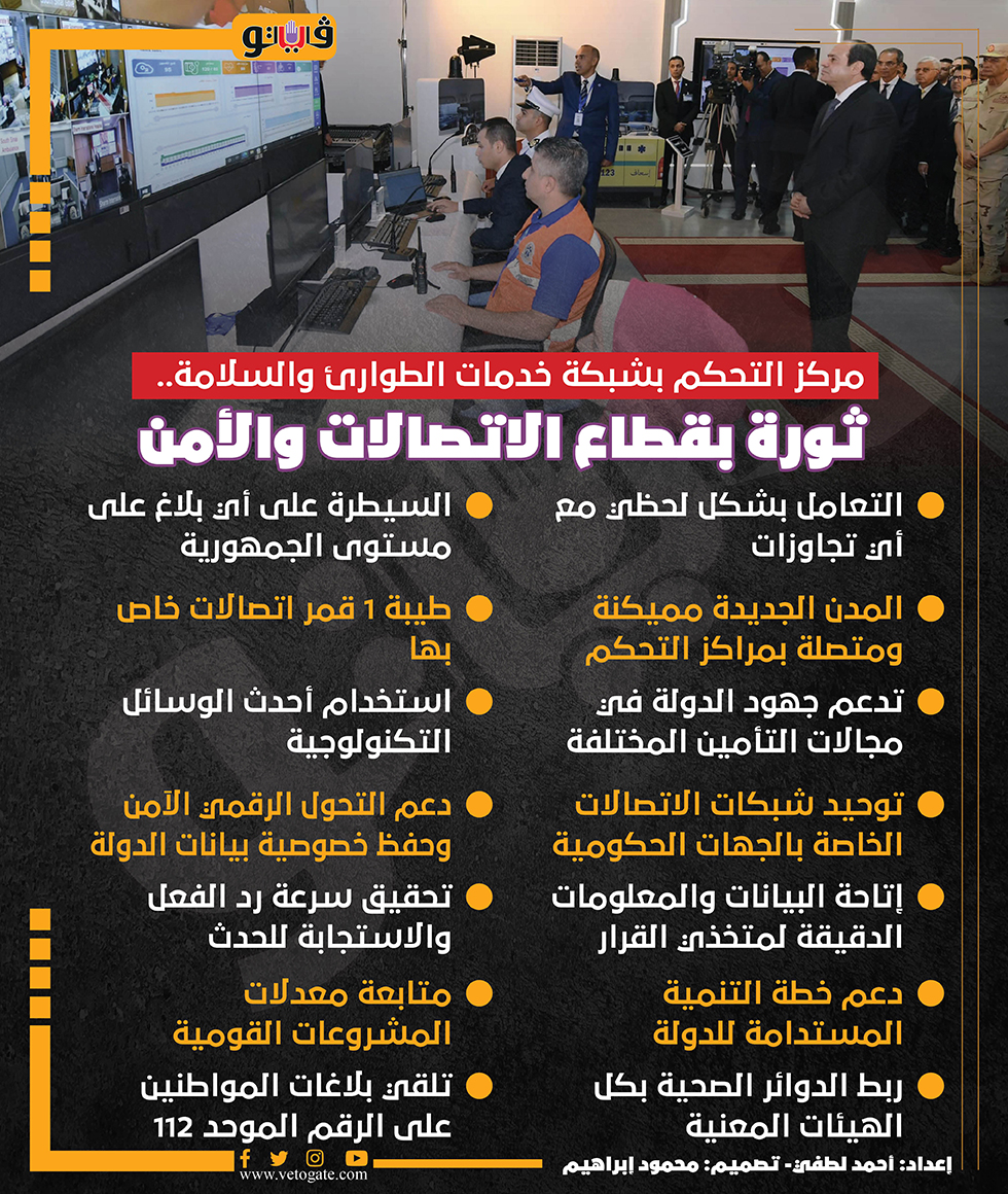 مركز التحكم بشبكة خدمات الطوارئ والسلامة.. ثورة بقطاع الاتصالات والأمن | إنفوجراف الإثنين 31/أكتوبر/2022 - 04:38 م 10/31/2022 4:38:14 PM مركز التحكم بالشبكة الوطنية الموحدة لخدمات الطوارئ والسلامة شارك طباعة 18 حجم الخط شارك طباعة الشبكة الوطنية الموحدة لخدمات الطوارئ الشبكة الوطنية الرعاية الحرجة