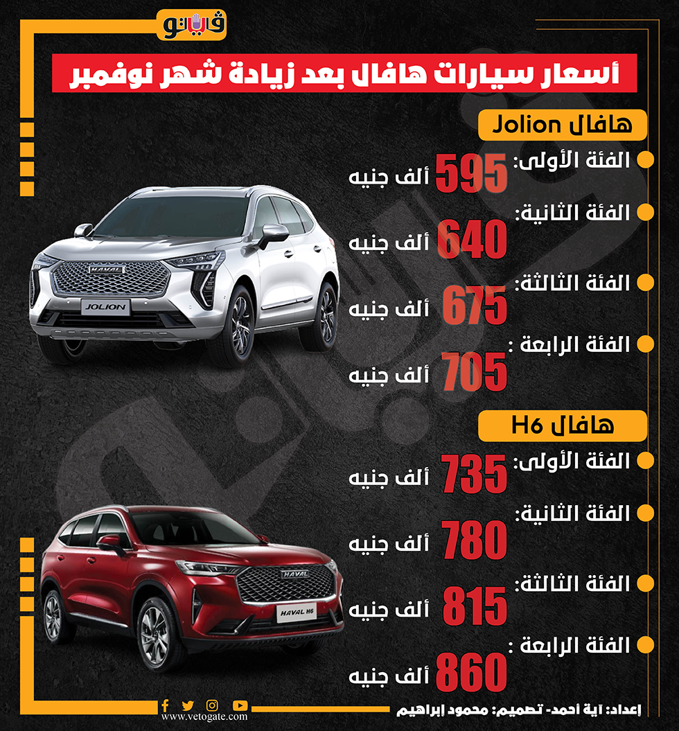 أسعار سيارات هافال بعد زيادة شهر نوفمبر | إنفوجراف الإثنين 31/أكتوبر/2022 - 09:42 م 10/31/2022 9:42:31 PM أسعار سيارات هافال آية أحمد شارك طباعة 18 حجم الخط شارك طباعة اسعار سيارات الفئة الرابعة سيارات هافال