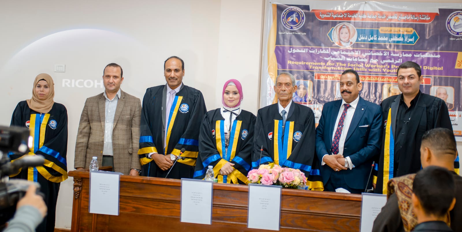 وجاءت الرسالة بعنوان متطلبات ممارسة الأخصائي الاجتماعي لمهارات التحول الرقمي مع جماعات الشباب.