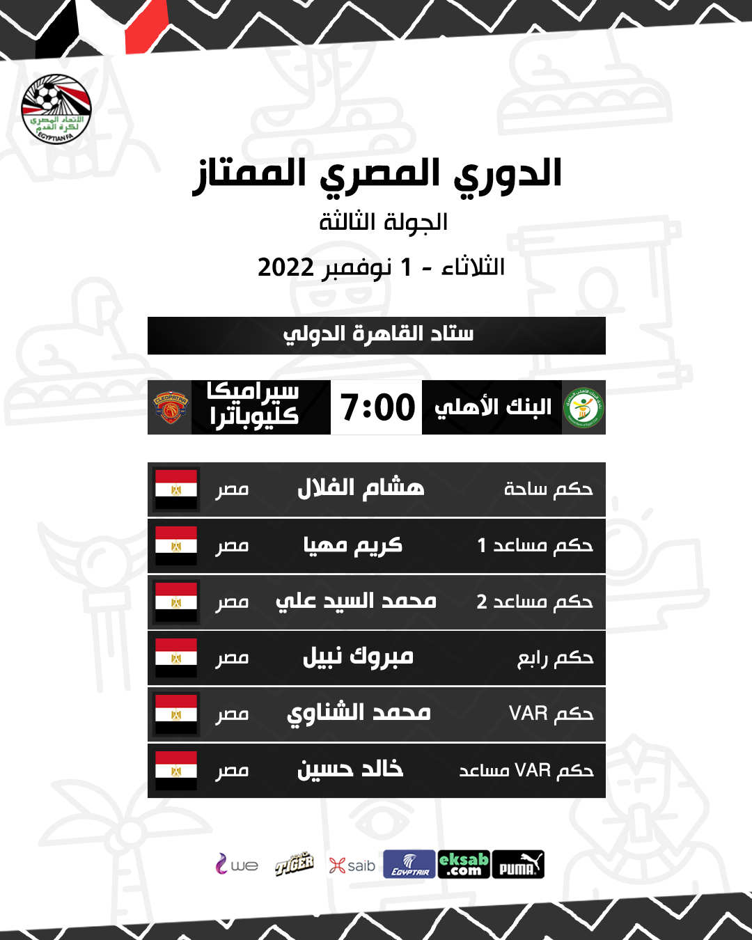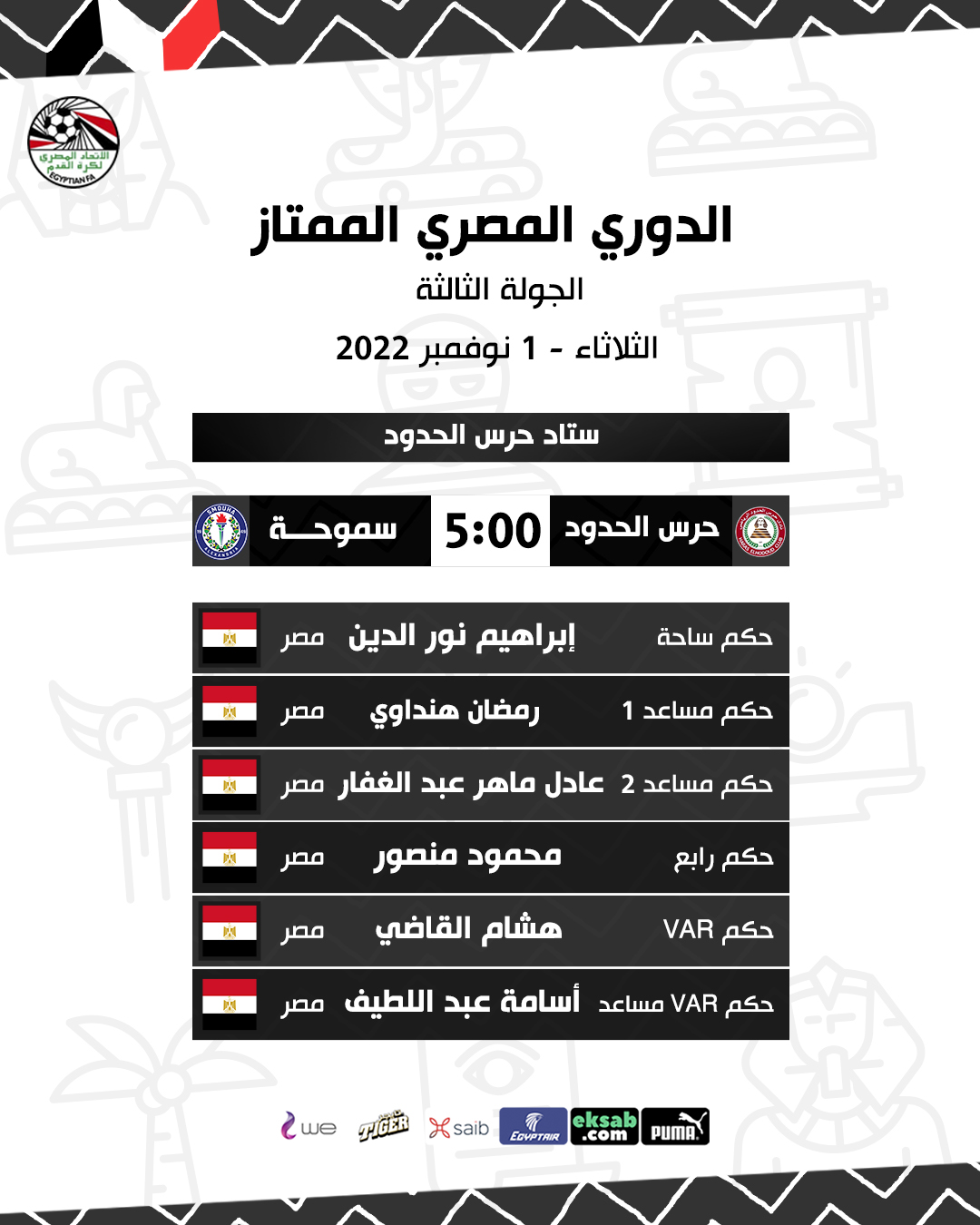 نور الدين حكما لحرس الحدود وسموحة والفلال للبنك الأهلي وسيراميكا