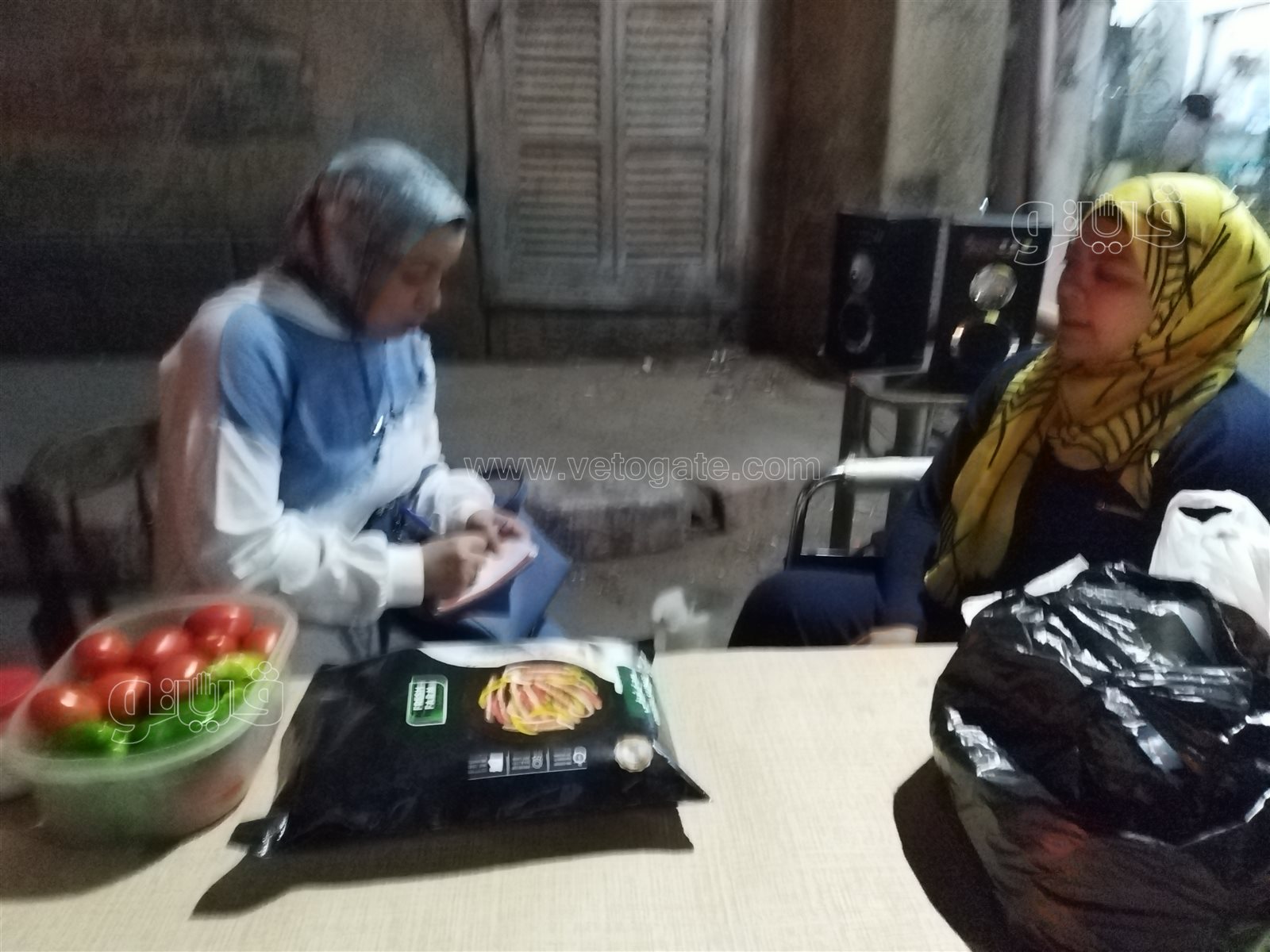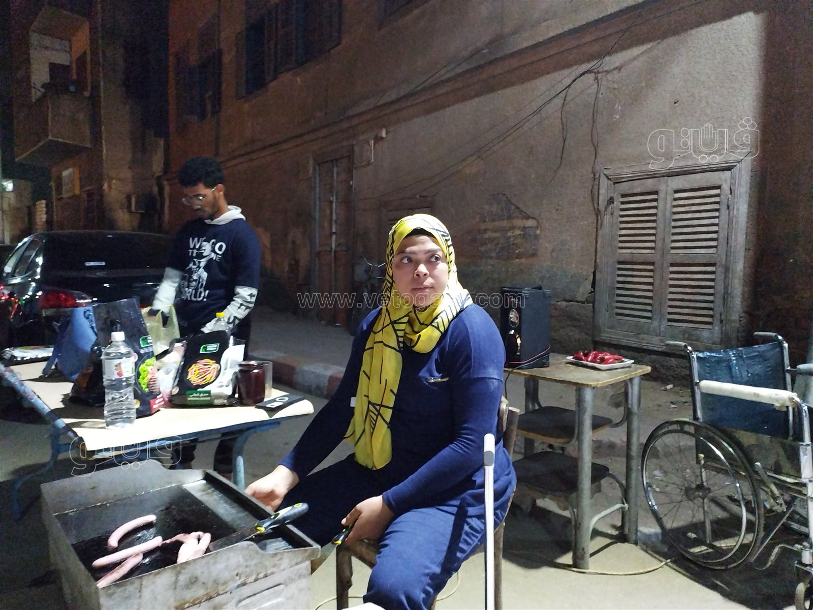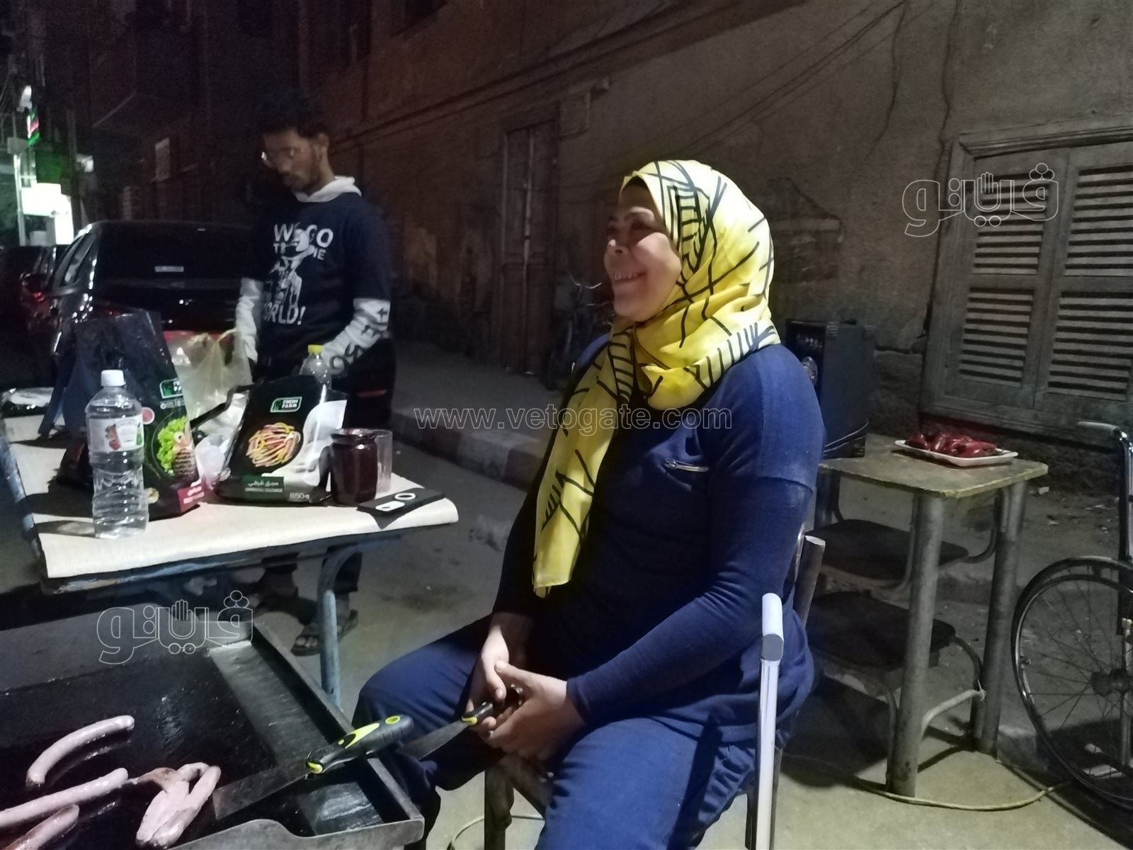 بملامح بسيطة ترتسم البسمة علي وجهها، تمسك بأدوات مطبخها الصغير أمام شواية لطهي اللحوم، تجلس أمام طاولتها الخشبية التي ترتكن عليها، والتي تفترش عليها الخضر والعيش وأكياس اللحوم، يساعدها شابان صغيران في مقتبل العمر بعد تعرضها لحادث سقوط أصابها في قدمها.
