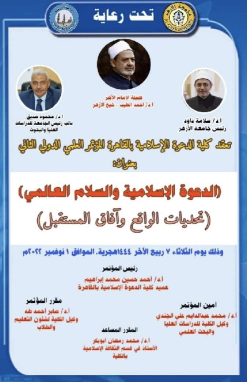 وقال الدكتور أحمد حسين عميد الكلية إن الجلسة الافتتاحية للمؤتمر الدولي الثاني لكلية الدعوة الإسلامية بالقاهرة (الدعوة الإسلامية والسلام العالمي تحديات الواقع وآفاق المستقبل) سيحضرها قيادات الأزهر الشريف، والأوقاف، ودار الإفتاء، وعدد من الأساتذة والطلاب بجامعة الأزهر والجامعات الأخرى، مشيرًا إلى أن المؤتمر يحظى برعاية فضيلة الإمام الأكبر الدكتور أحمد الطيب شيخ الأزهر، وفضيلة الدكتور سلامة داود رئيس الجامعة والدكتور محمود صديق نائب رئيس الجامعة للدراسات العليا والبحوث، ويشرف على جلساته أساتذة الكلية بإشراف ومتابعة من الدكتور صابر طه وكيل الكلية لشئون التعليم والطلاب، والدكتور محمد الجندي وكيل الكلية للدراسات العليا والبحوث.
