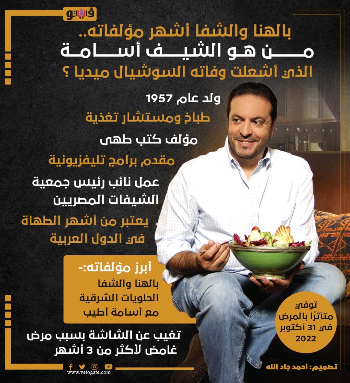 بالهنا والشفا أشهر مؤلفاته.. من هو الشيف أسامة الذي أشعلت وفاته السوشيال ميديا ؟ | انفوجراف الثلاثاء 01/نوفمبر/2022 - 01:30 م 11/1/2022 1:30:12 PM شارك طباعة 18 حجم الخط شارك طباعة