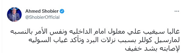وكتب أحمد شوبير تغريدة على تويتر "غالبا سيغيب علي معلول امام الداخليه ونفس الأمر بالنسبة لمارسيل كولر بسبب نزلات البرد وتأكد غياب السولية لإصابته بشد خفيف".