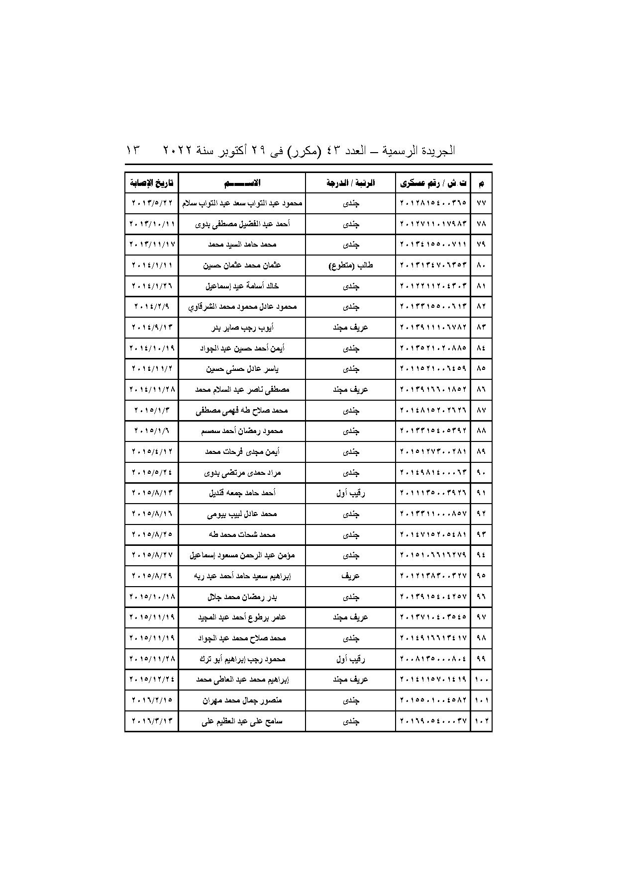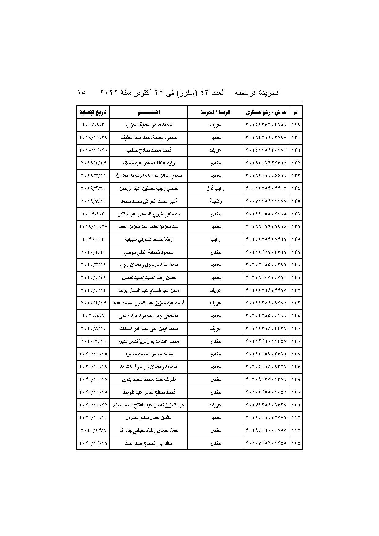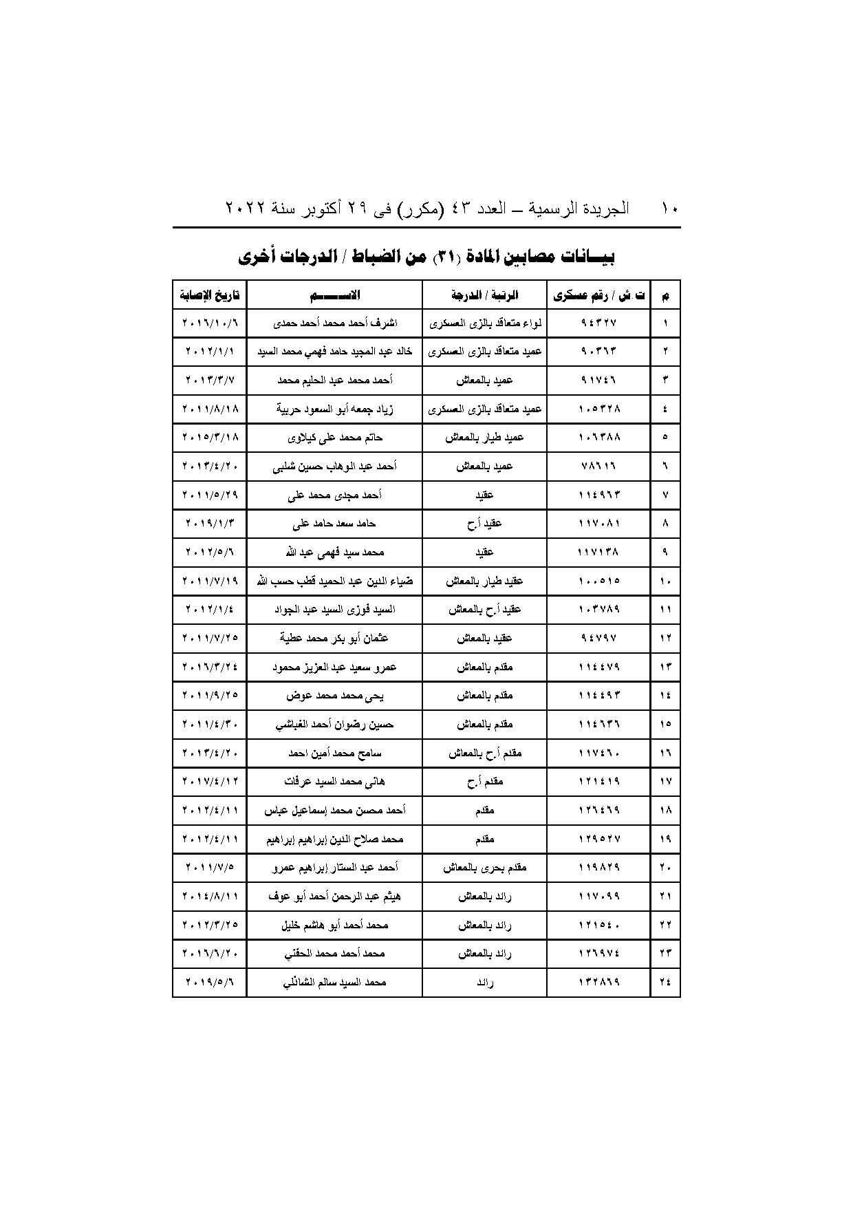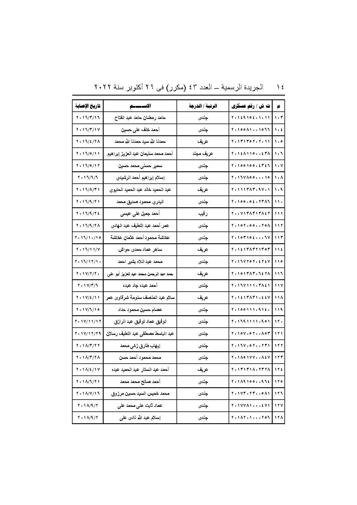 نشرت الجريدة الرسمية في عددها رقم 43 (مكرر) الصادر في 29 أكتوبر 2022، قرار رئيس الوزراء رقم 76 لسنة 2022، بشأن إصافة 185 جندي وضابط من المتوفين والمصابين بالقوات المسلحة لصندوق تكريم الشهداء وضحايا العمليات الحربية والإرهابية.