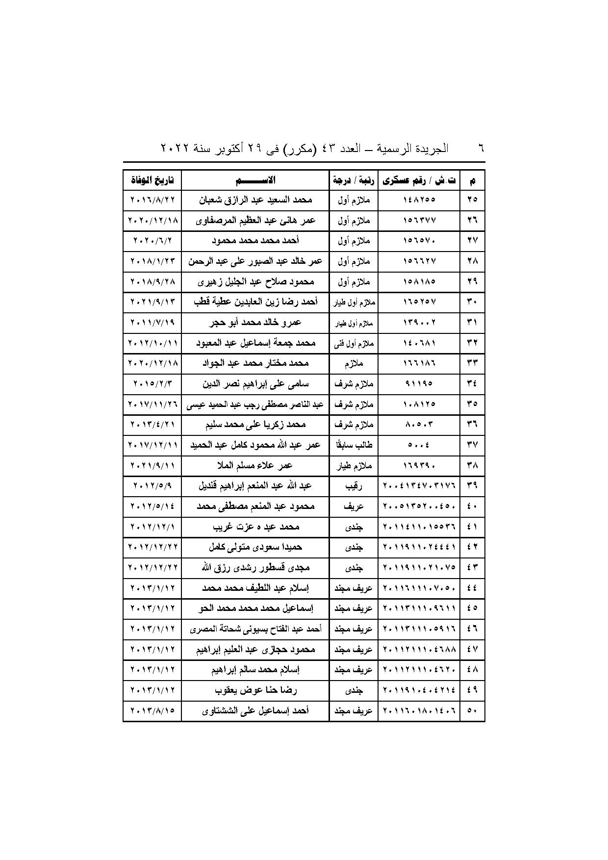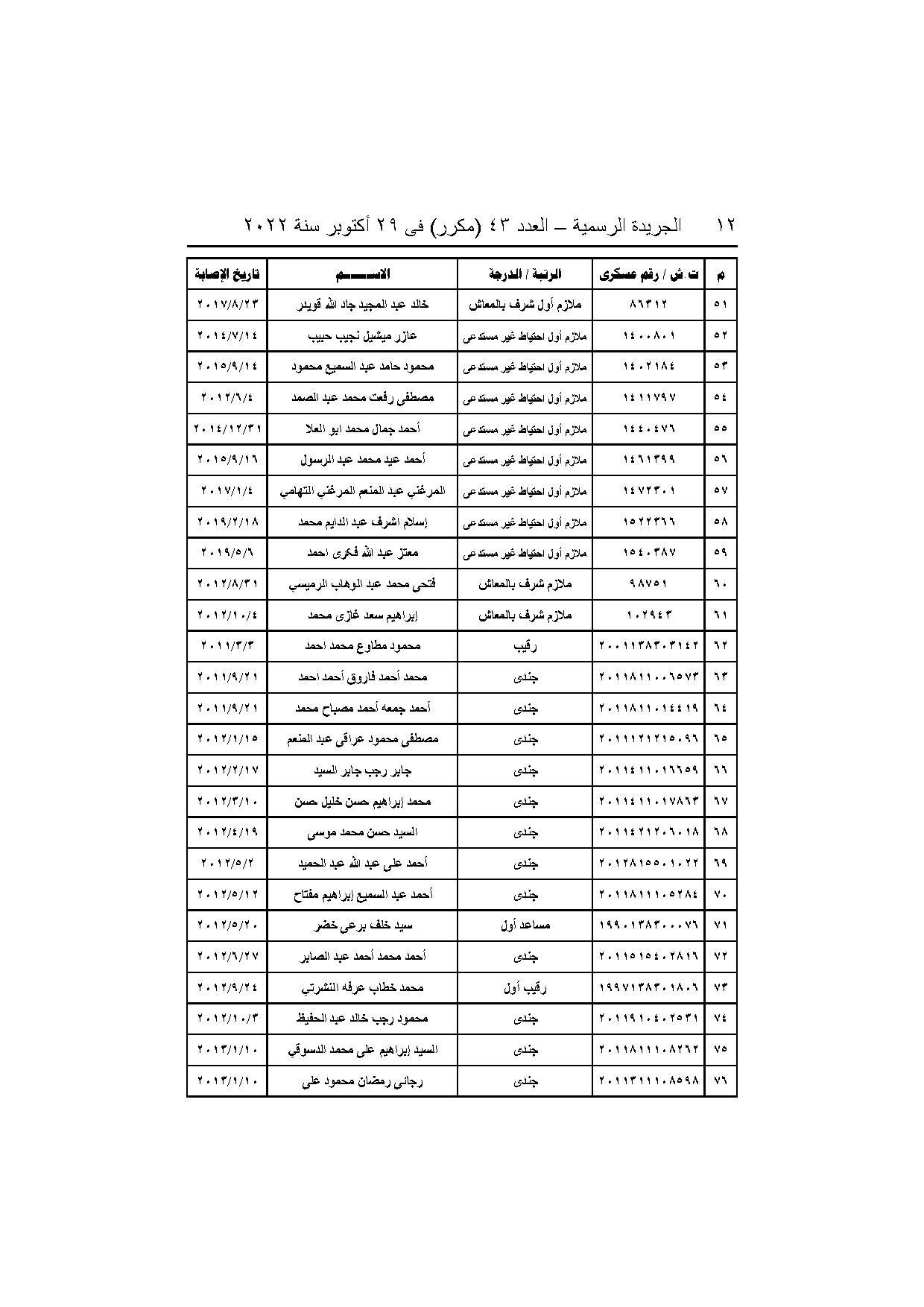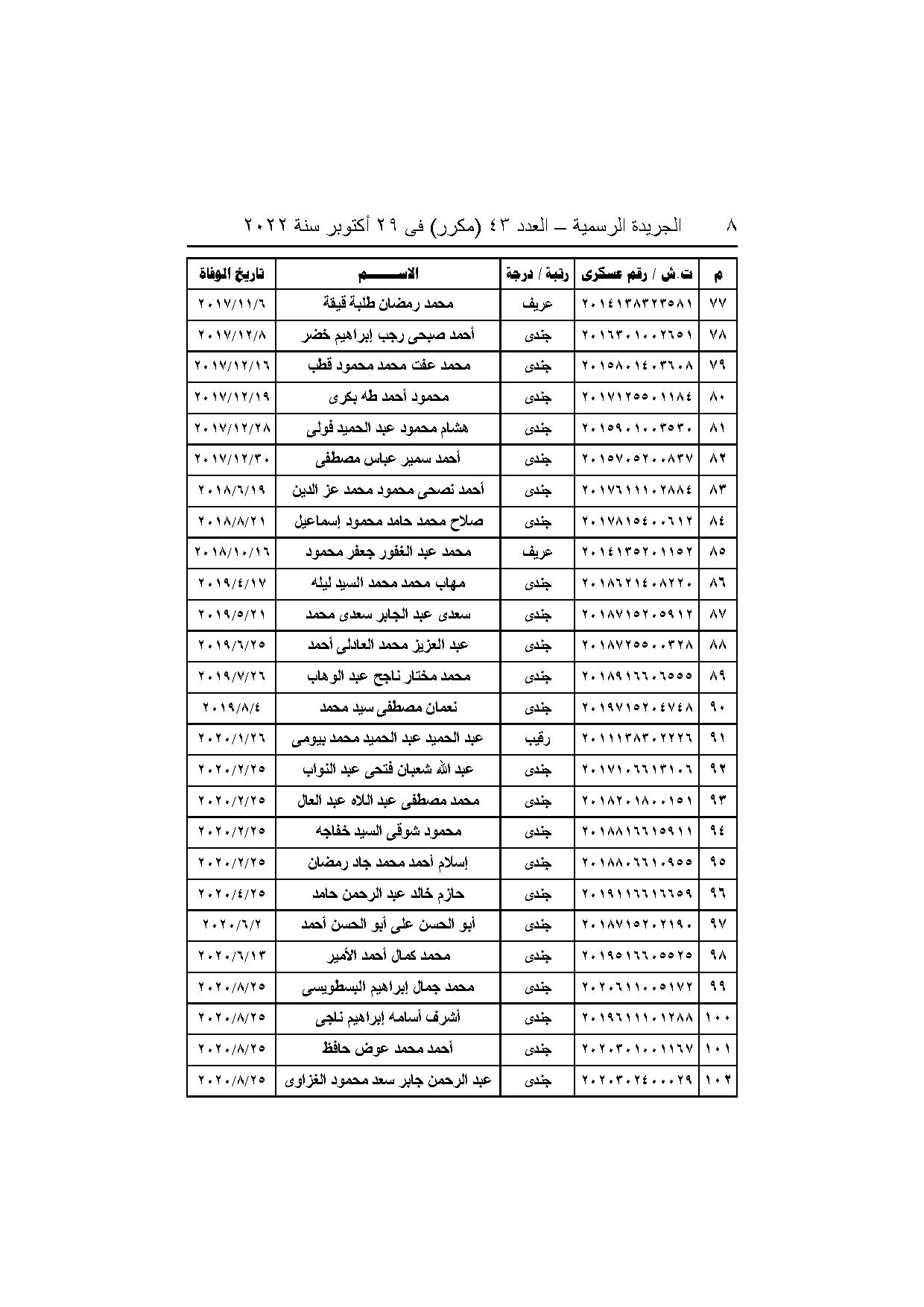 نشرت الجريدة الرسمية في عددها رقم 43 (مكرر) الصادر في 29 أكتوبر 2022، قرار رئيس الوزراء رقم 76 لسنة 2022، بشأن إصافة 185 جندي وضابط من المتوفين والمصابين بالقوات المسلحة لصندوق تكريم الشهداء وضحايا العمليات الحربية والإرهابية.