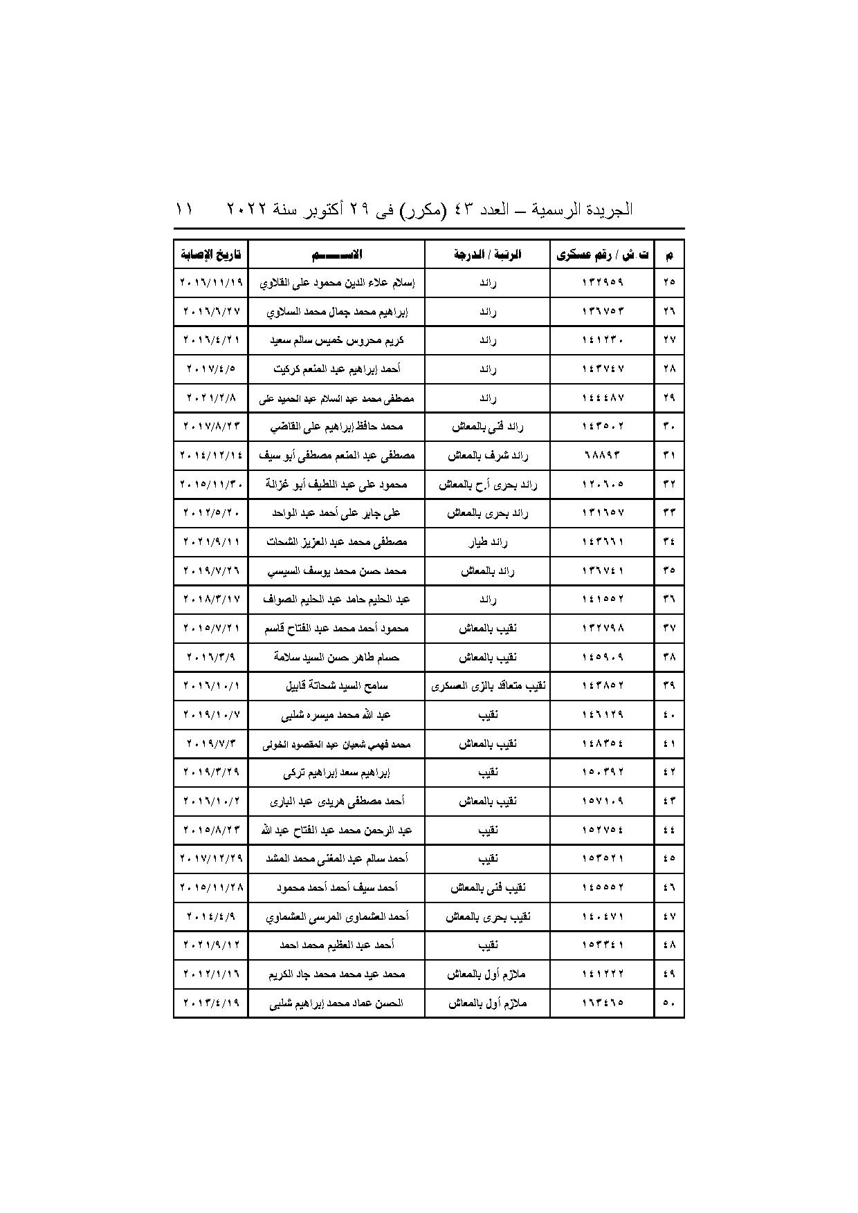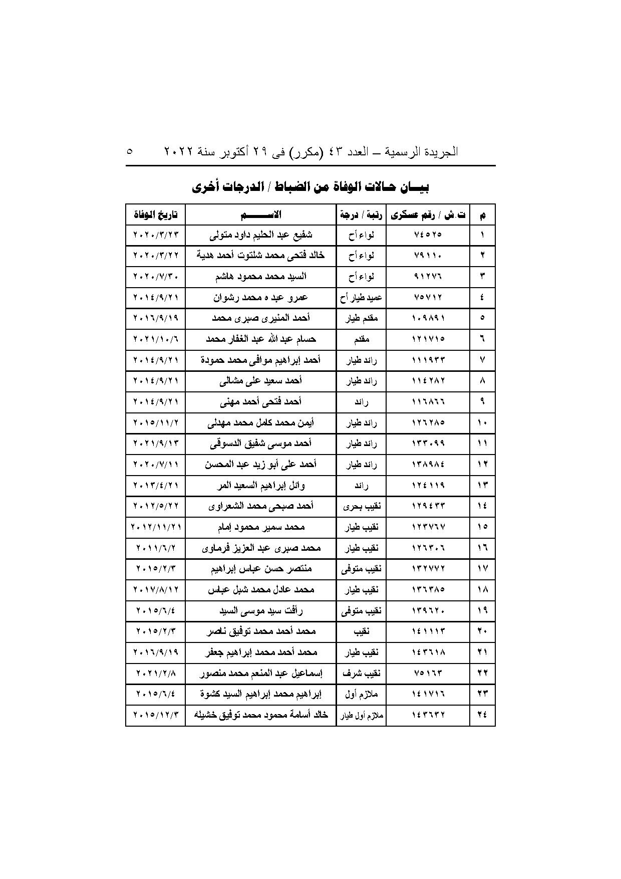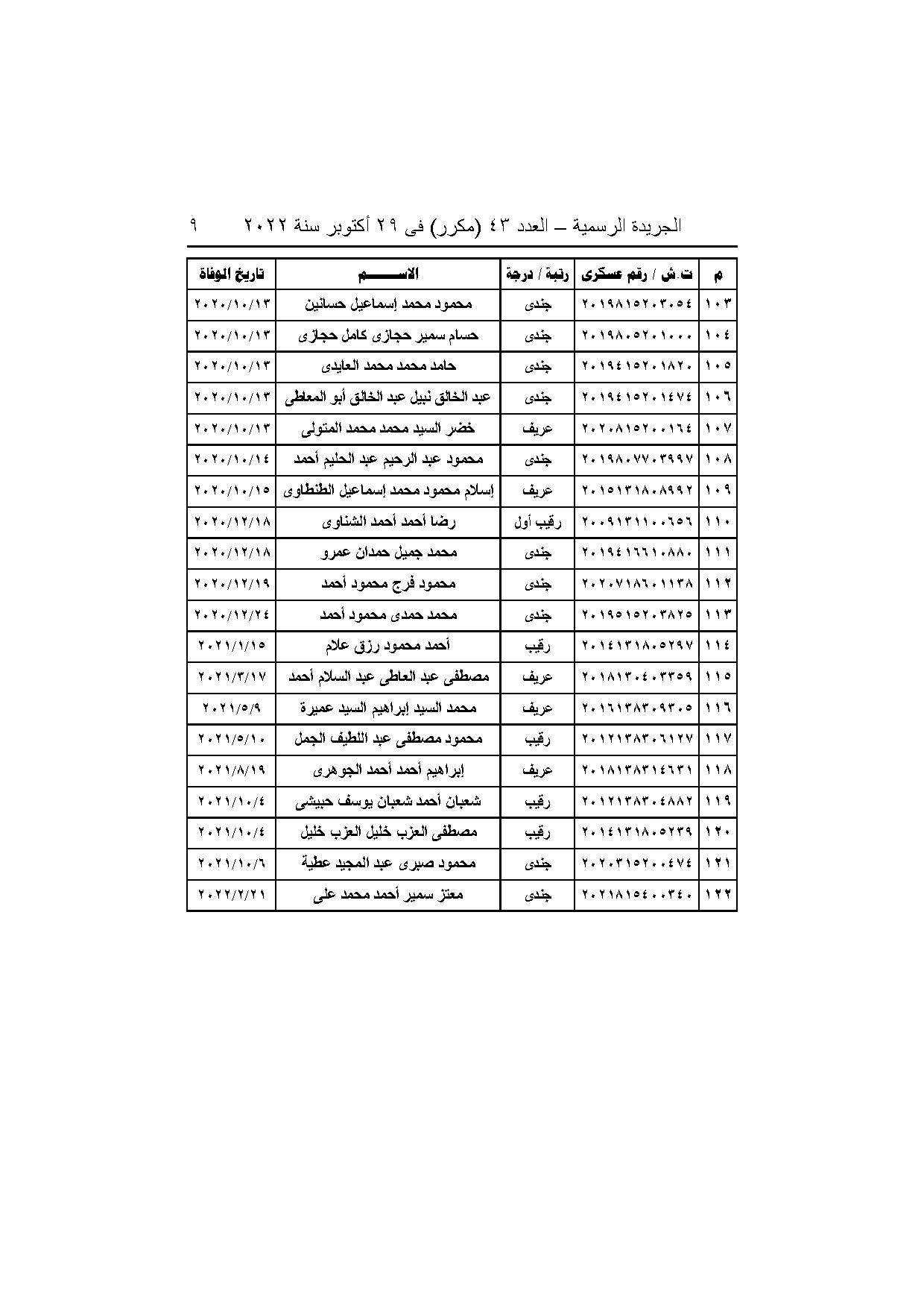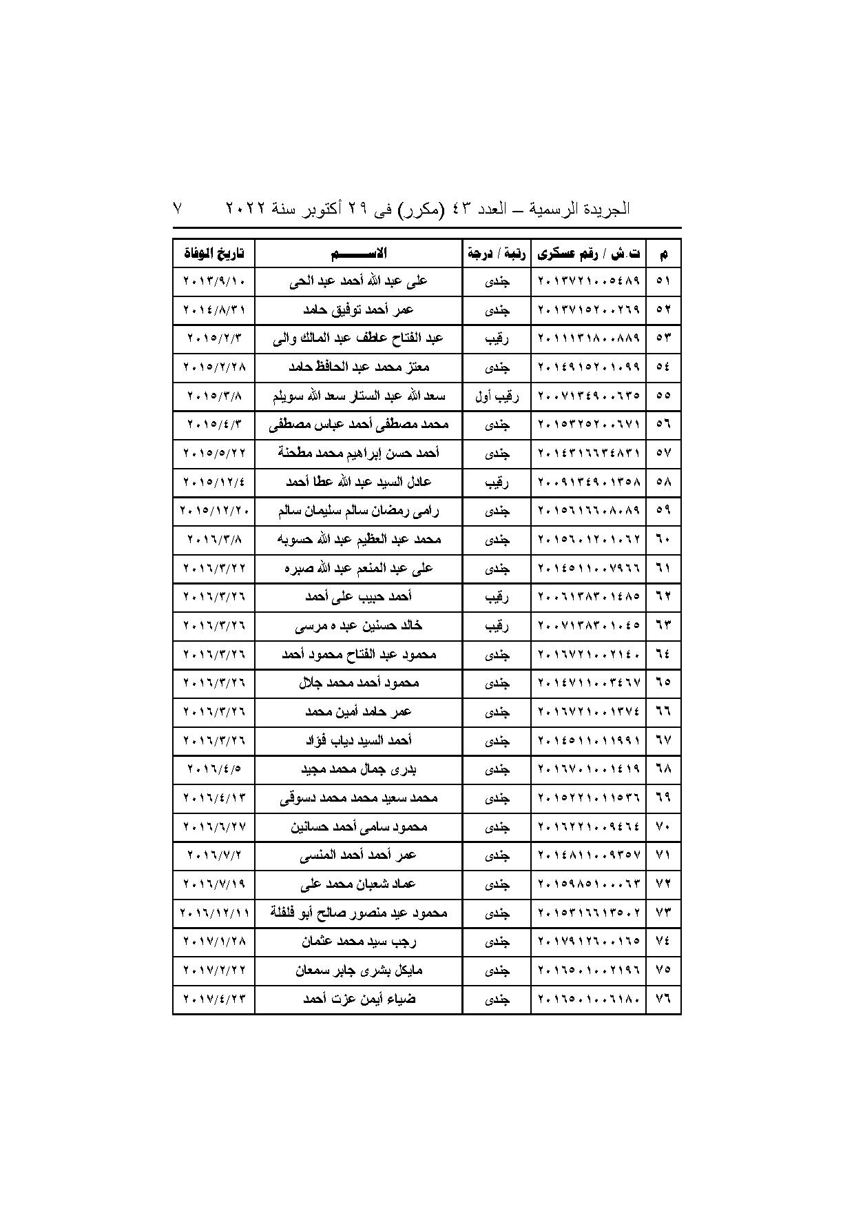 نشرت الجريدة الرسمية في عددها رقم 43 (مكرر) الصادر في 29 أكتوبر 2022، قرار رئيس الوزراء رقم 76 لسنة 2022، بشأن إصافة 185 جندي وضابط من المتوفين والمصابين بالقوات المسلحة لصندوق تكريم الشهداء وضحايا العمليات الحربية والإرهابية.
