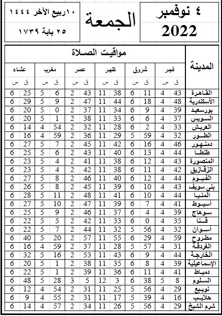 مواقيت الصلاة اليوم وفقًا للتوقيت المحلي لمدينتي القاهرة والإسكندرية وعدد من مدن ومحافظات الجمهورية من واقع بيانات الهيئة العامة للمساحة: