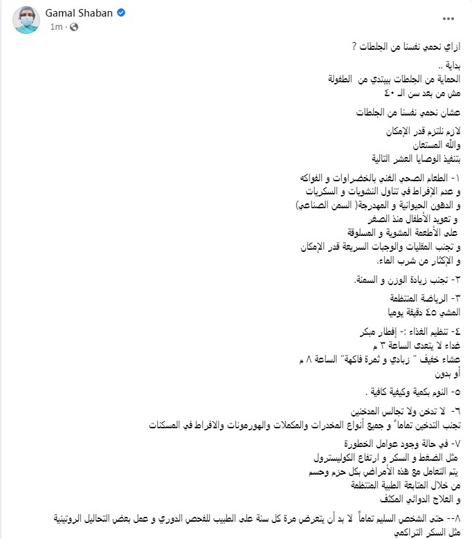 وكتب جمال شعبان تدوينة عبر "الفيس بوك" قال فيها: "ازاي نحمي نفسنا من الجلطات؟ بداية.. الحماية من الجلطات بيبتدي من الطفولة مش من بعد سن الـ٤٠، عشان نحمي نفسنا من الجلطات لازم نلتزم قدر الإمكان بتنفيذ الوصايا العشر التالية: ١- الطعام الصحي الغني بالخضراوات والفواكه وعدم الإفراط في تناول النشويات والسكريات والدهون الحيوانية والمهدرجة (السمن الصناعي)، وتعويد الأطفال منذ الصغر على الأطعمة المشوية والمسلوقة، وتجنب المقليات والوجبات السريعة قدر الإمكان، والإكثار من شرب الماء."