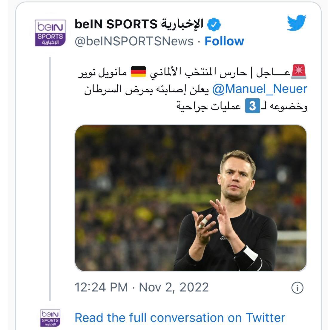 أعلنت شبكة بي إن سبورت الإخبارية عن تعرض مانويل نوير حارس مرمى نادي بايرن ميونخ للإصابة بمرض سرطان الجلد وخضوعه إلى ثلاثة عمليات جراحية.
