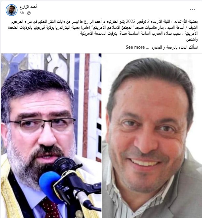 وكتب القارئ والطبيب المصري أحمد زارع تدوينة على الفيس بوك "بمشيئة الله تعالى؛ الليلة الأربعاء 2 نوڤمبر 2022 يتلو المقرئ الدكتور أحمد الزارع ما تيسر من آيات الذكر الحكيم في عزاء المرحوم الشيف/ أسامة السيد، بدار مناسبات مسجد “المجتمع الإسلامي الأمريكي” (ماس) بمدينة آليكزاندريا بولاية ڤيرچينيا بالولايات المتحدة الأمريكية، عقب صلاة المغرب الساعة السادسة مساءً بتوقيت العاصمة الأمريكية واشنطن".