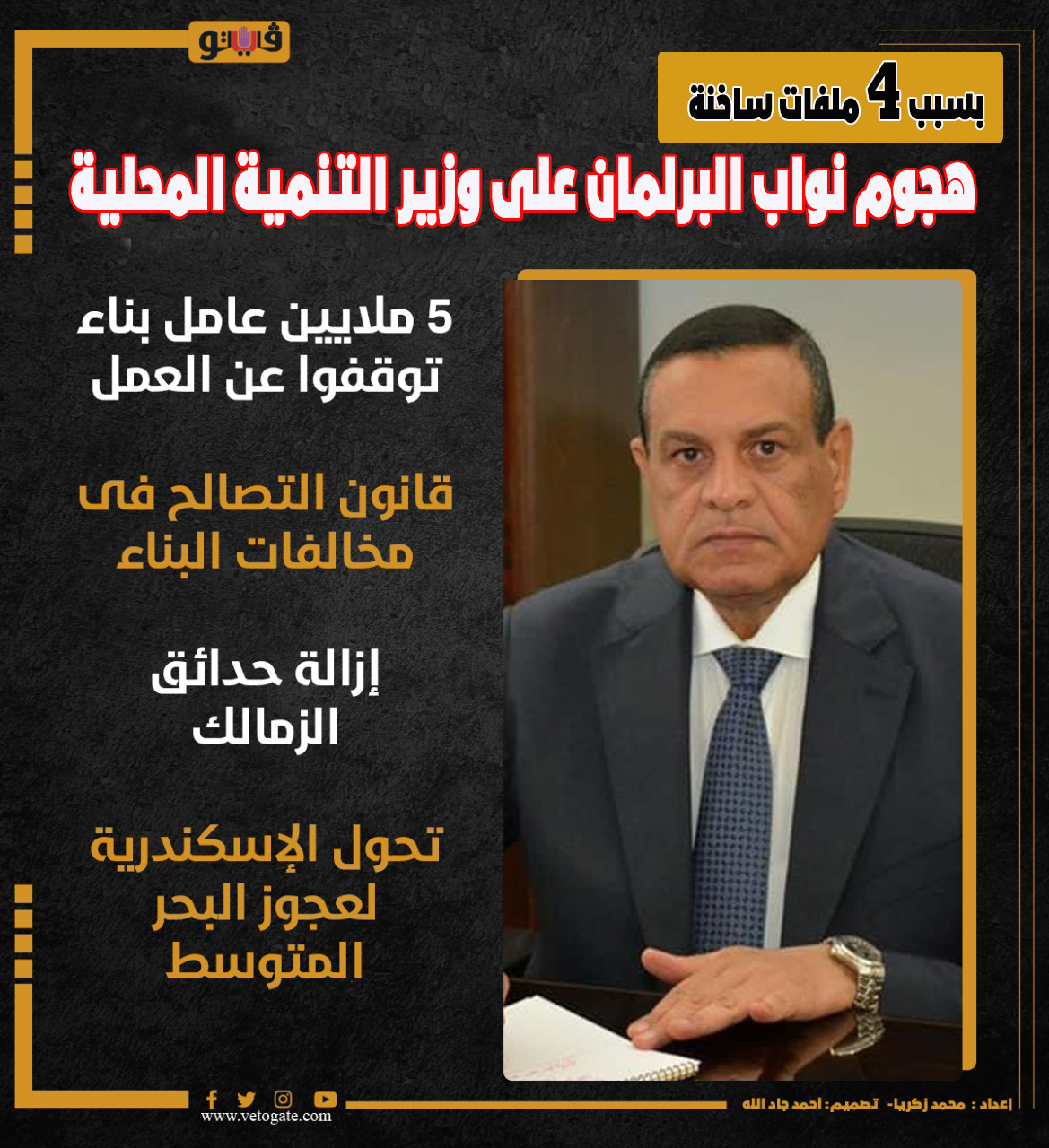 بسبب 4 ملفات ساخنة.. هجوم نواب البرلمان على وزير التنمية المحلية| إنفوجراف الأربعاء 02/نوفمبر/2022 - 03:26 م 11/2/2022 3:26:01 PM اللواء هشام آمنة محمد زكريا شارك طباعة 18 حجم الخط شارك طباعة الجلسة العامة لمجلس النواب التصالح فى مخالفات البناء التنمية المحلية اللواء هشام آمنة قانون التصالح في مخالفات البناء وزير التنمية المحلية