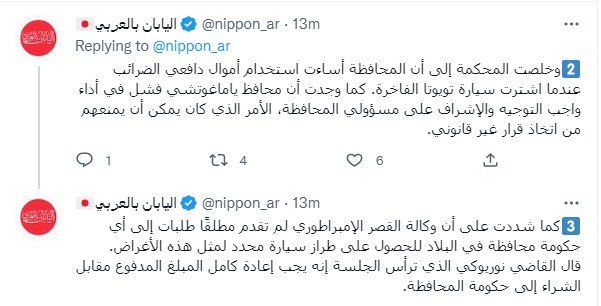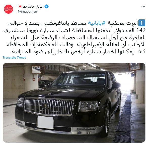 وكتب موقع "اليابان بالعربي" تغريدة على تويتر "أمرت محكمة يابانية محافظ ياماغوتشي بسداد حوالي 142 ألف دولار أنفقتها المحافظة لشراء سيارة تويوتا سنشري الفاخرة من أجل استقبال الشخصيات الرفيعة مثل السفراء الأجانب أو العائلة الإمبراطورية وقالت المحكمة إن المحافظة كان بإمكانها اختيار سيارة أرخص بالنظر إلى قيود الميزانية."