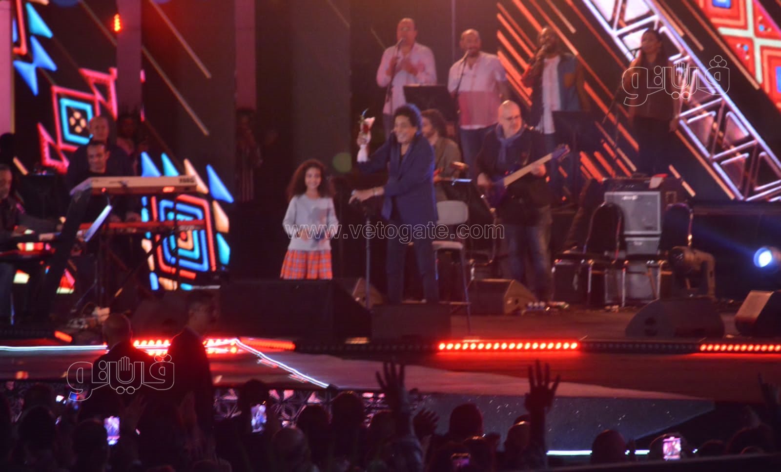 واستقبلها محمد منير على خشبة المسرح والتقط معها صورا تذكارية خلال غنائه بالحفل.