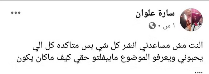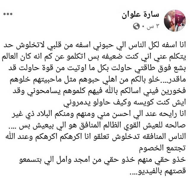وألحقت سارة علوان منشورها السابق بآخر قالت فيه: "أنا آسفة لكل الناس الذين حبوني، آسفة من قلبي، لا تجعلوا أي أحد يتكلم عني، كنت ضعيفة، بس تحدثوا عن كم كان العالم بشعًا فوق طاقتي، حاولت بكل ما أوتيت من قوة، حاولت قد ما أقدر".
