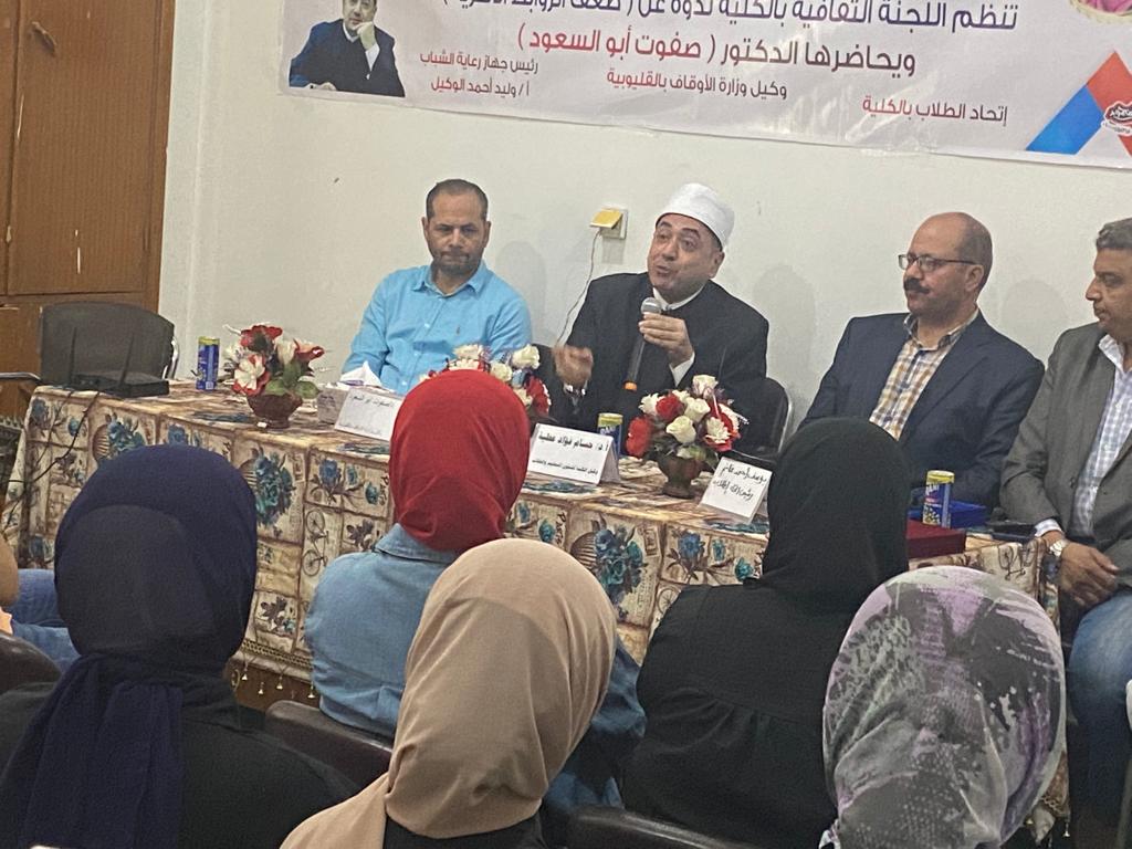 نظمت كلية الطب البيطري بجامعة بنها ندوة عن أهمية الترابط الأسري حاضرها صفوت أبو السعود وكيل وزارة الأوقاف بالقليوبية بحضور الدكتورة أماني عباس عميد الكلية والدكتور حسام فؤاد عطية وكيل الكلية لشئون التعليم والطلاب بالتعاون مع الاتحاد الكلية واللجنة الثقافية والأسر والمبادرات بالكلية.