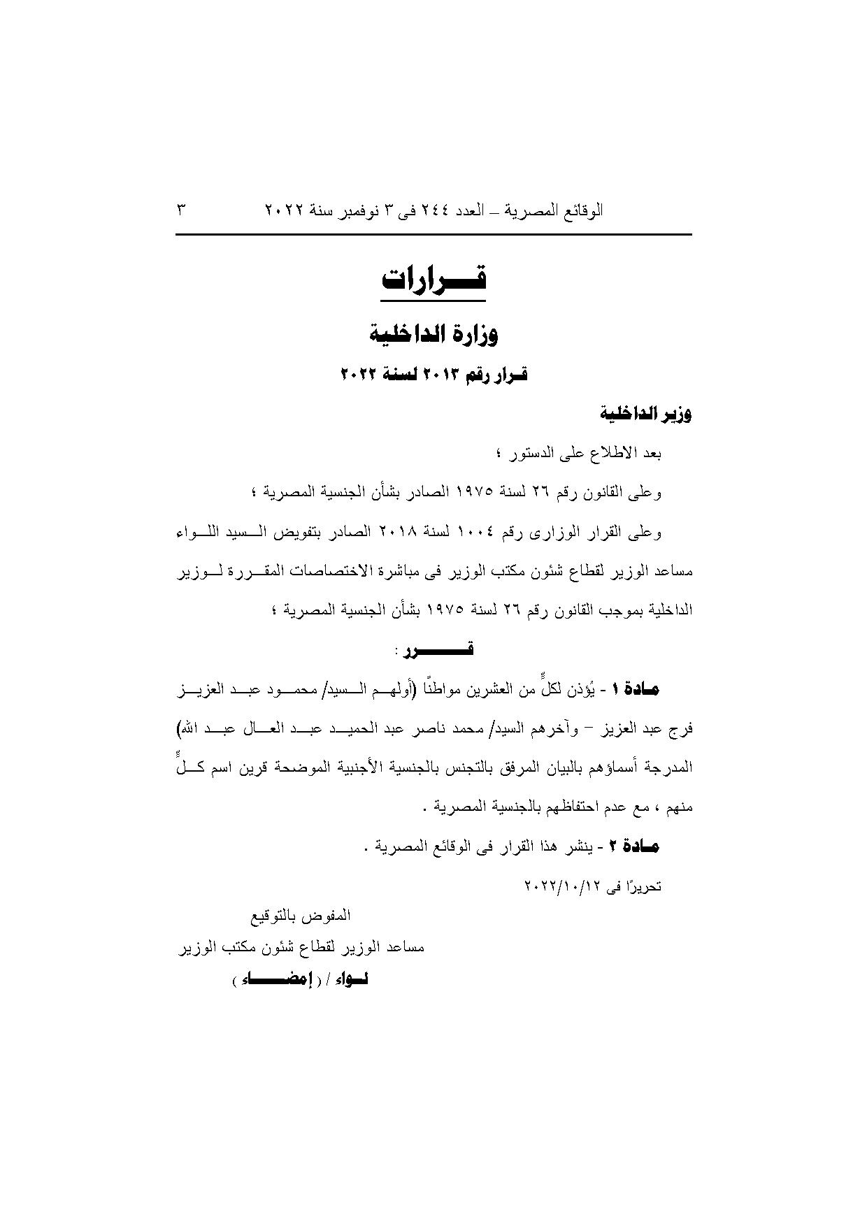 -قرار وزير الداخلية رقم 2013 لسنة 2022، بشأن الأذن لكل من العشرين مواطنًا (أولهم محمود عبد العزيز فرج عبد العزيز، وآخرهم محمد ناصر عبد الحميد عبد العال عبد الله) المدرجة أسماؤهم بالبيان المرفق، بالتجنس بالجنسية الأجنبية الموضحة قرين اسم كل منهم، مع عدم احتفاظهم بالجنسية المصرية.