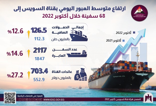 قناة السويس ما زالت تسجل أرقامًا قياسية في معدلات العبور اليومي والحمولات الصافية، إذ عبرت نحو 2117 سفينة بإجمالي حمولات صافية 126.5 مليون طن في أكتوبر 2022، مقارنة بـ 1847 سفينة بإجمالي حمولات صافية 112.3 مليون طن في أكتوبر 2021، وارتفعت عائدات القناة إلى 703.4 ملايين دولار في أكتوبر 2022، مقارنةً بـ 552.9 مليون دولار، بنسبة زيادة 27.2%.