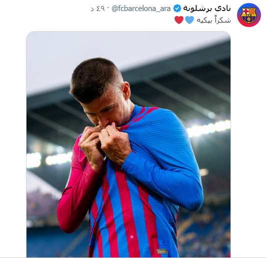 ونشر الحساب الرسمي للنادي بموقع التواصل الاجتماعي "تويتر" صورة لبيكيه وهو يُقبل شعار النادي، وكتب: "حياة خصصها لبرشلونة، شكرًا لك بيكيه"