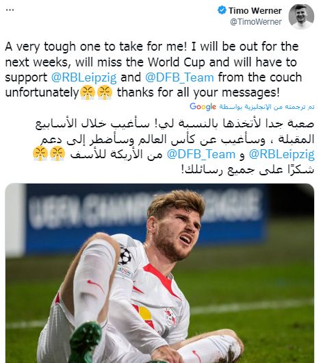 وتأكد غياب فيرنر عن المنتخب الألماني في مونديال 2022، بعد إصابته في كاحل القدم.