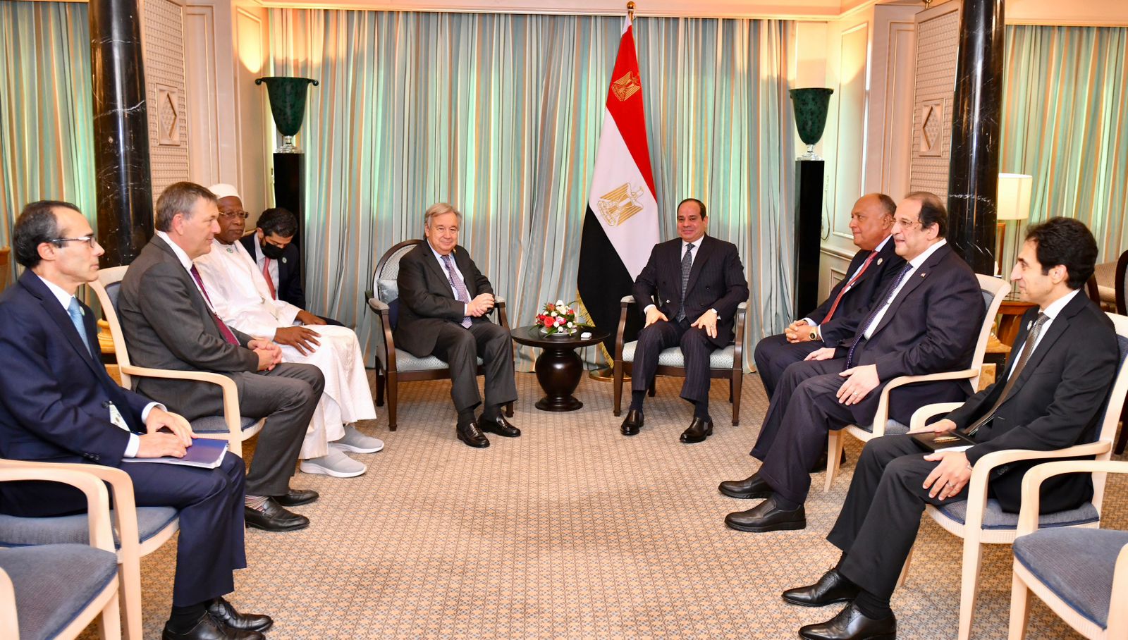 كما أكد الرئيس تقـدير مصـر للتعـاون المثمـر والمتنـامي مـع الأمـم المتحـدة فـيما يتعلق بقضية تغير المناخ وتأثيراتها على العالم، مشيرًا في هذا الصدد إلى استضافة مصر المرتقبة للقمة العالمية للمناخ COP27 بمدينة شرم الشيخ خلال شهر نوفمبر الجاري، وسعي مصر للعمل خلال هذه القمة على تبني رؤية شاملة تتضمن احتياجات الدول النامية، مع مراعاة قدرات الدول المتقدمة في ذات الوقت، وذلك بهدف الوصول لحلول والتزامات عملية قابلة للتطبيق دوليًا فيما يتعلق بمواجهة التحديات المناخية، بما يساعد على تحقيق الأهداف الأممية للتنمية المستدامة.