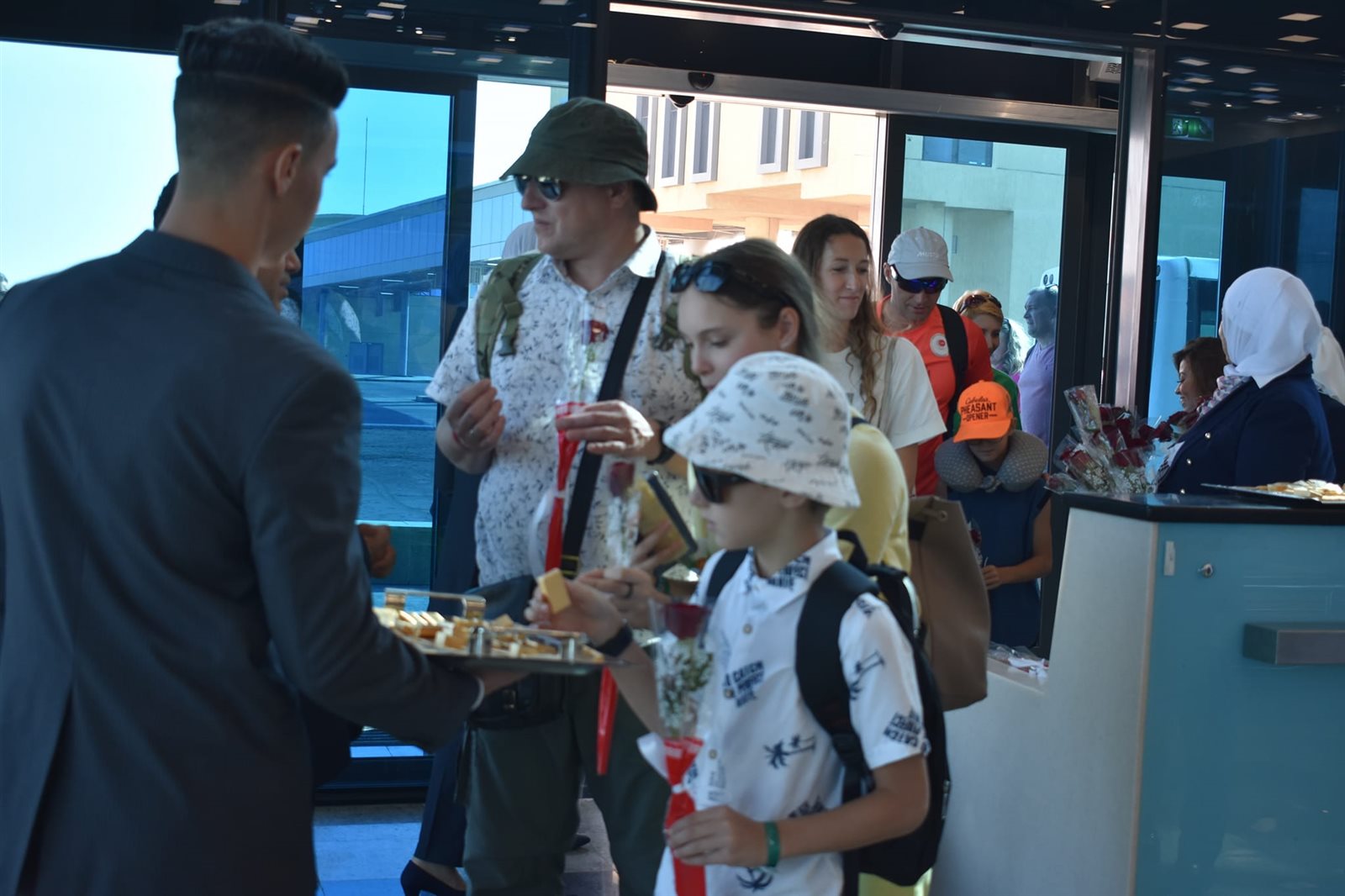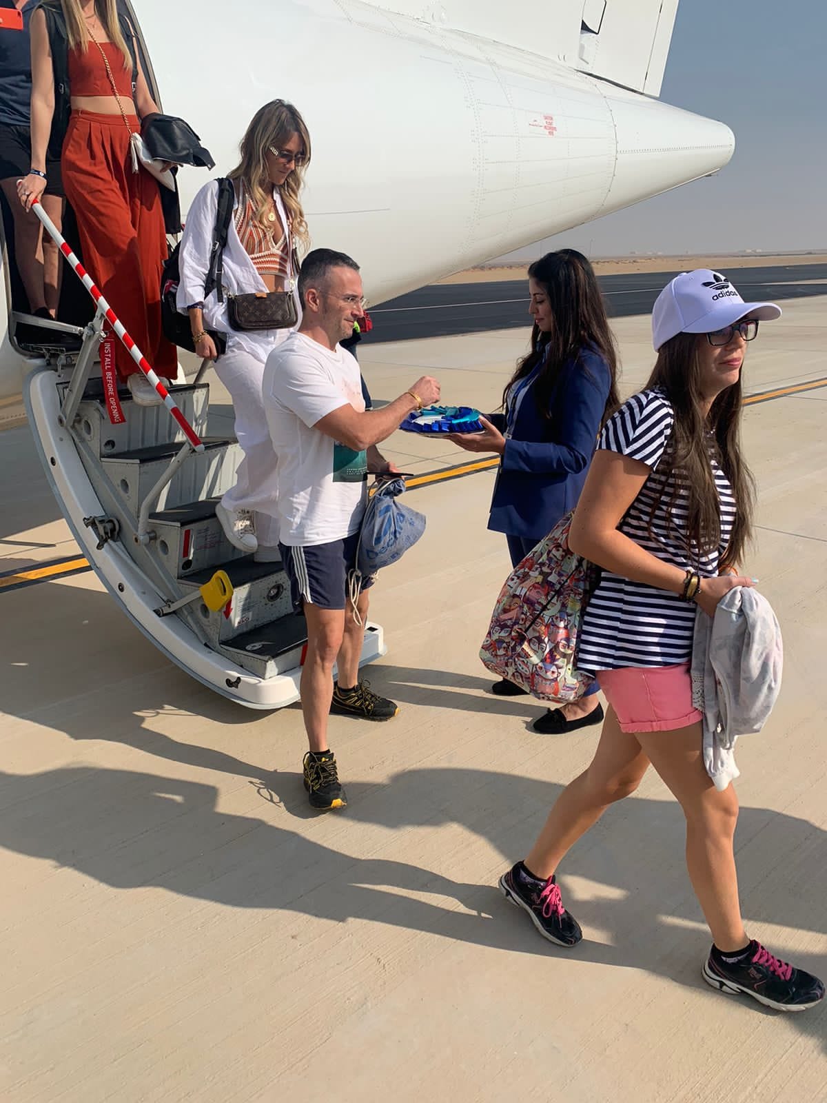 وقام فريق من العلاقات العامة بالمطار باستقبال الركاب والترحيب بهم وتقديم الهدايا التذكارية لهم.