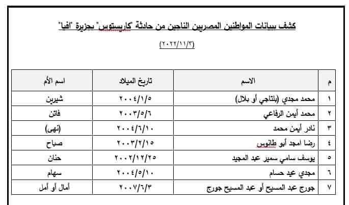 نشر جروب الجالية المصرية فى اليونان، اليوم، كشفا بأسماء المصريين الذين تم إنقاذهم من الغرق فى حادثة مركب الهجرة غير الشرعية القادمة من تركيا، وكذلك أسماء المفقودين.