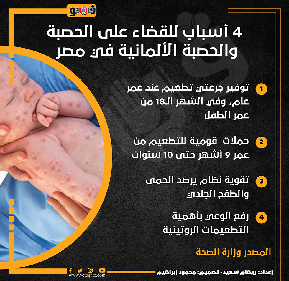 4 أسباب للقضاء على الحصبة والحصبة الألمانية في مصر | إنفوجراف السبت 05/نوفمبر/2022 - 07:05 م 11/5/2022 7:05:07 PM مرض الحصبة ريهام سعيد شارك طباعة 18 حجم الخط شارك طباعة الحمى والطفح الجلدي الحصبة الألمانية الحصبة الألماني وزارة الصحة