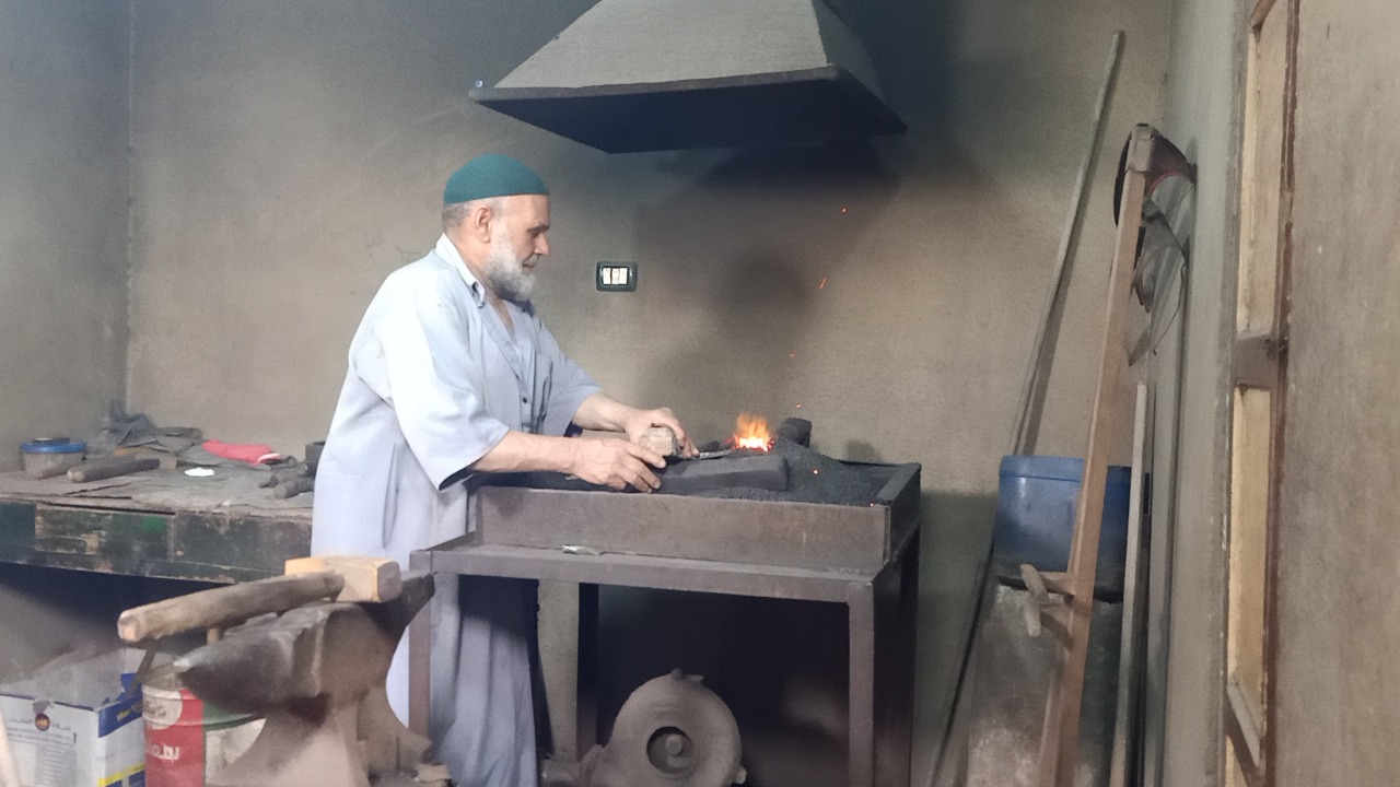 أحمد الحداد يطوع الحديد بالنار ويستغل مهارته الفنية في تشكيل الحديد وصنع أدوات زراعية مختلفة يستخدمها المزارع في أداء مهامه الزراعية.
