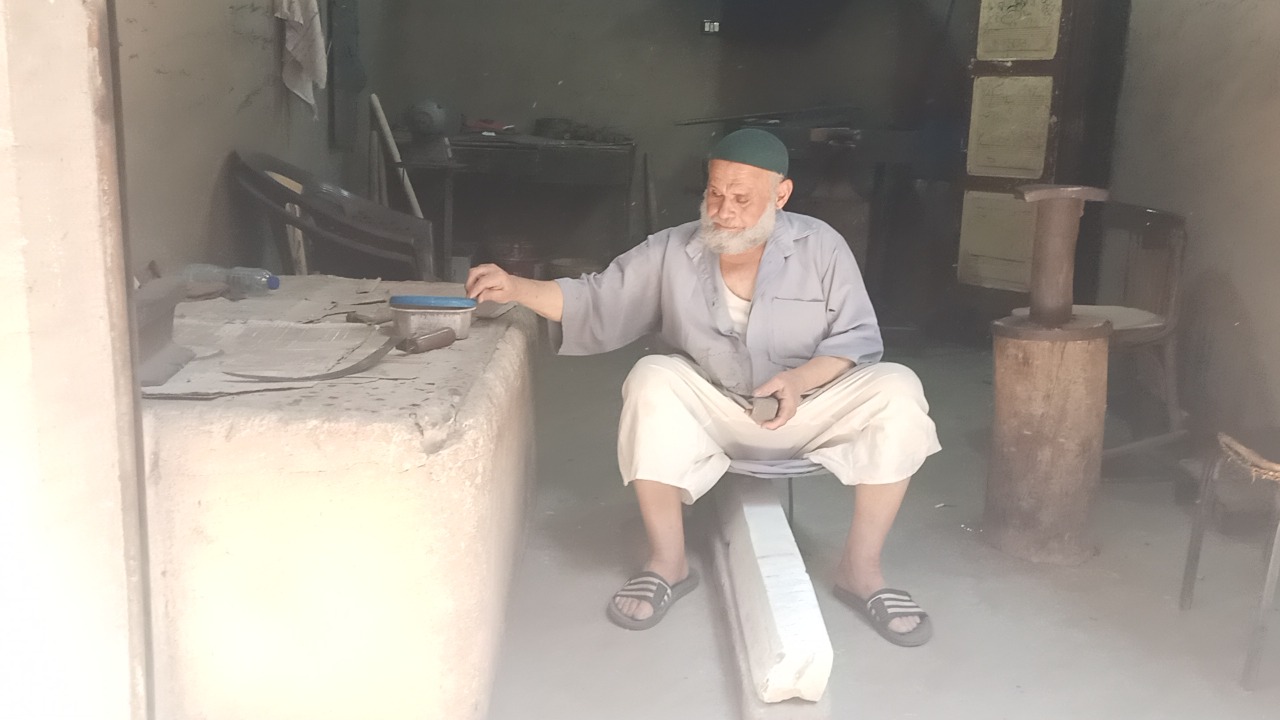 وأشار الحداد إلى أن المرحلة الأخيرة يجلس فيها على حجر من الرخام لا يتعدى عرضه 30 سم ويبدأ في التحكم في الأداة التي يقوم بإعادة رجمها من جديد عن طريق قدميه، ليتحكم في الأداة، ويبدأ في استخدام قطعة من الصلب والمطرقة بطريقة دائرية يعتقد من يراها انها سهلة وبسيطة ولكن من الصعب أن يفعلها شخص غير متمكن من هذه المهنة الشاقة.