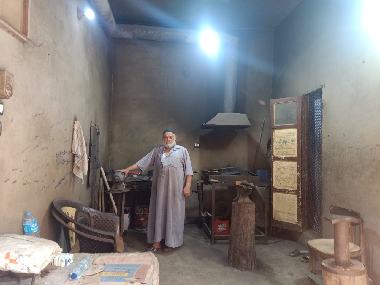 داخل جراج المنزل الذي تحول لورشة بين الأدوات الحديدية والنار تجد رجل سبعيني تظهر على وجهه تجاعيد الزمن في قرية البجلات التابعة لمركز الجمالية بمحافظة الدقهلية يقوم بصناعة الأدوات الزراعية.