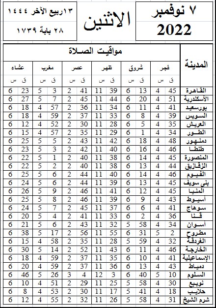 مواقيت الصلاة اليوم وفقًا للتوقيت المحلي لمدينتي القاهرة والإسكندرية وعدد من مدن ومحافظات الجمهورية من واقع بيانات الهيئة العامة للمساحة: